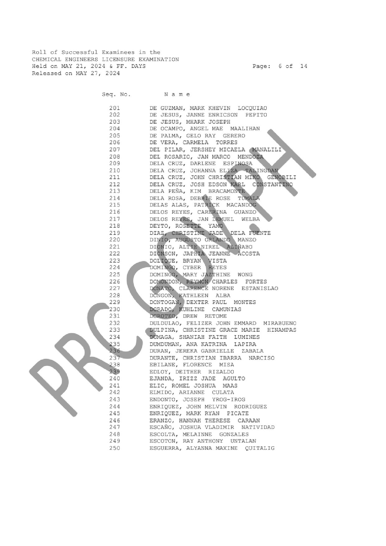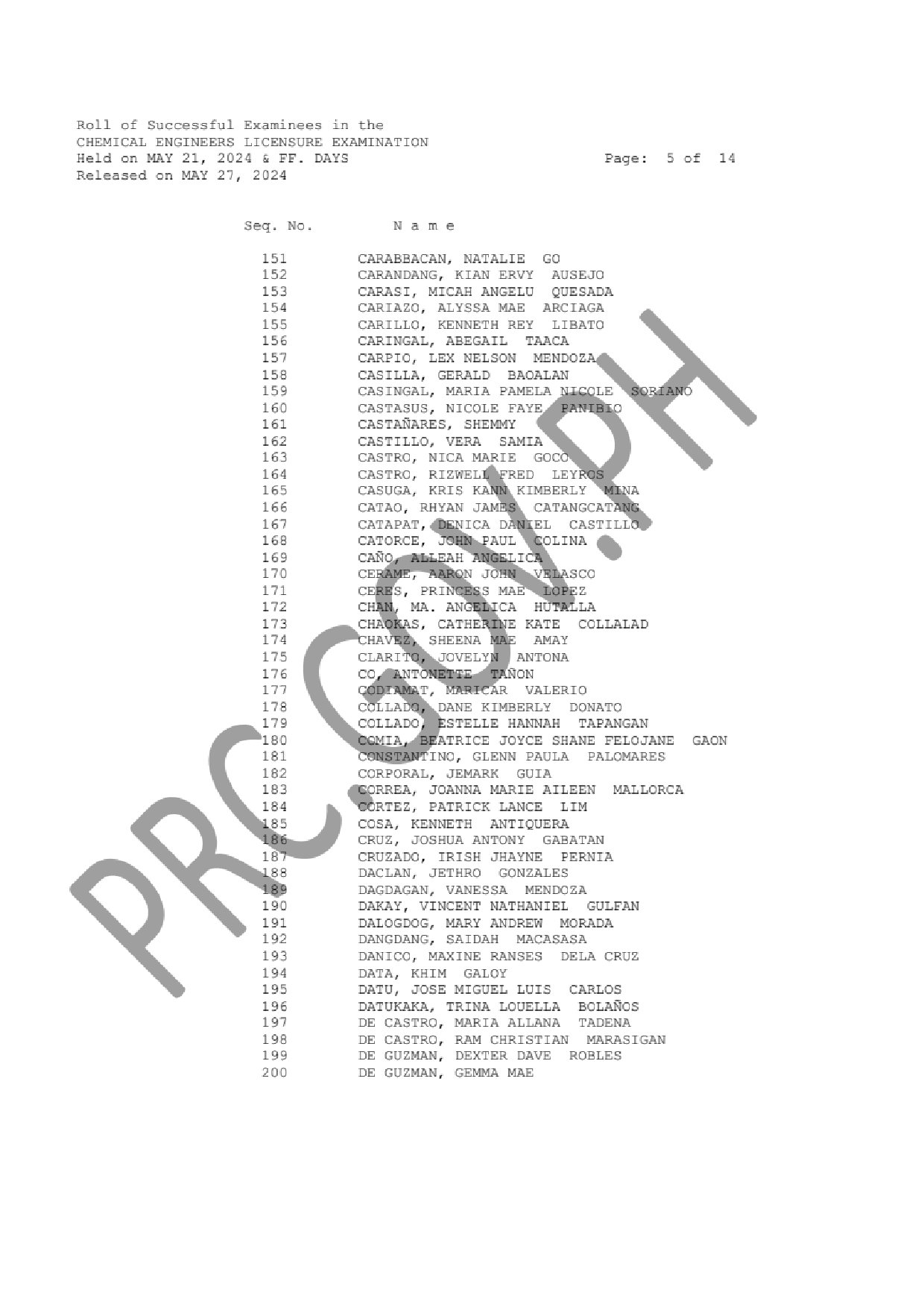 LIST OF PASSERS: The Professional Regulation Commission (PRC) announces that 640 out of 928 passed the Chemical Engineers Licensure Examination given by the Board of Chemical Engineering in N. C. R., Baguio, Cebu, Iloilo, Legazpi and Lucena this May 2024.