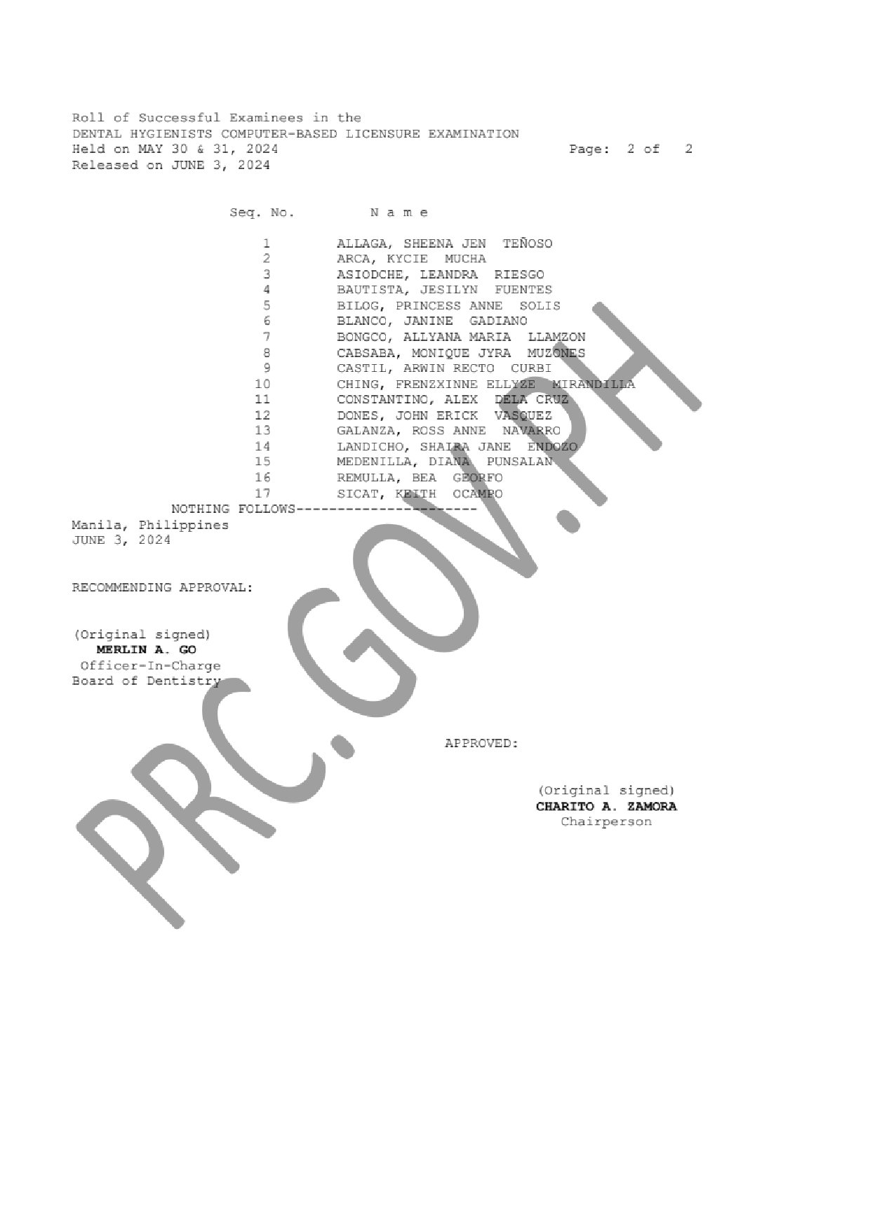 DHLE LIST OF PASSERS: The Professional Regulation Commission (PRC) announces that 17 out of 41 passed the Dental Hygienists Computer-Based Licensure Examination given by the Board of Dentistry in N. C. R. last May 2024.