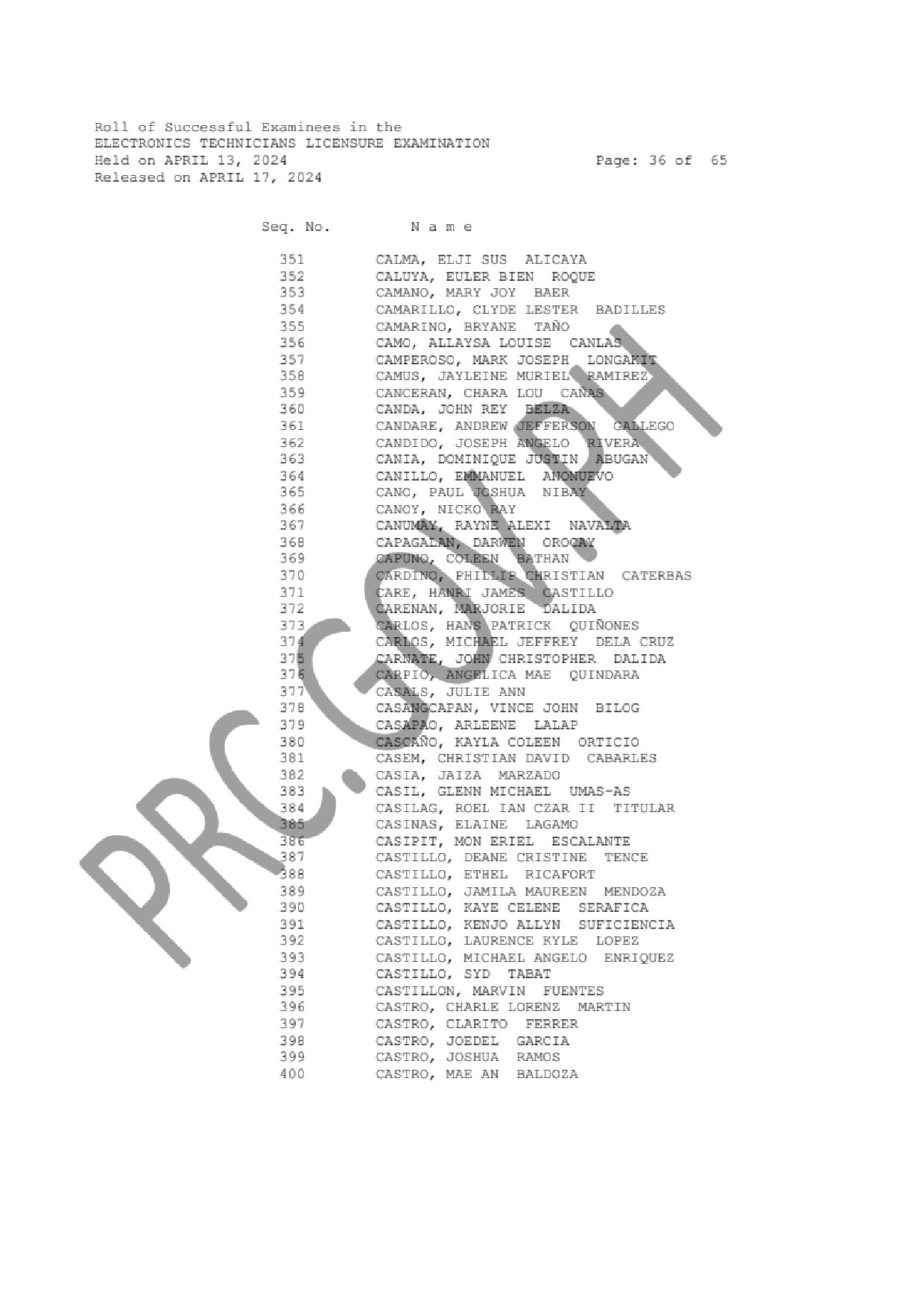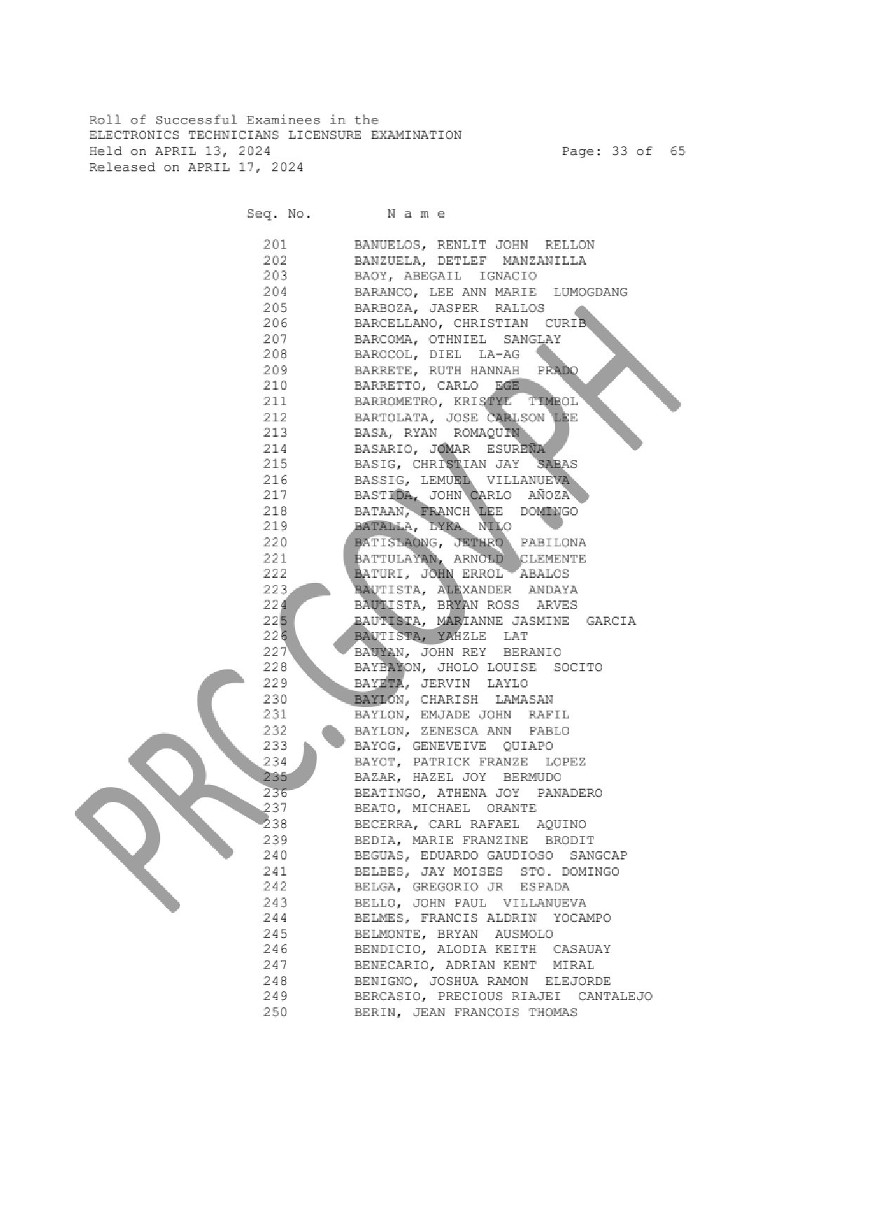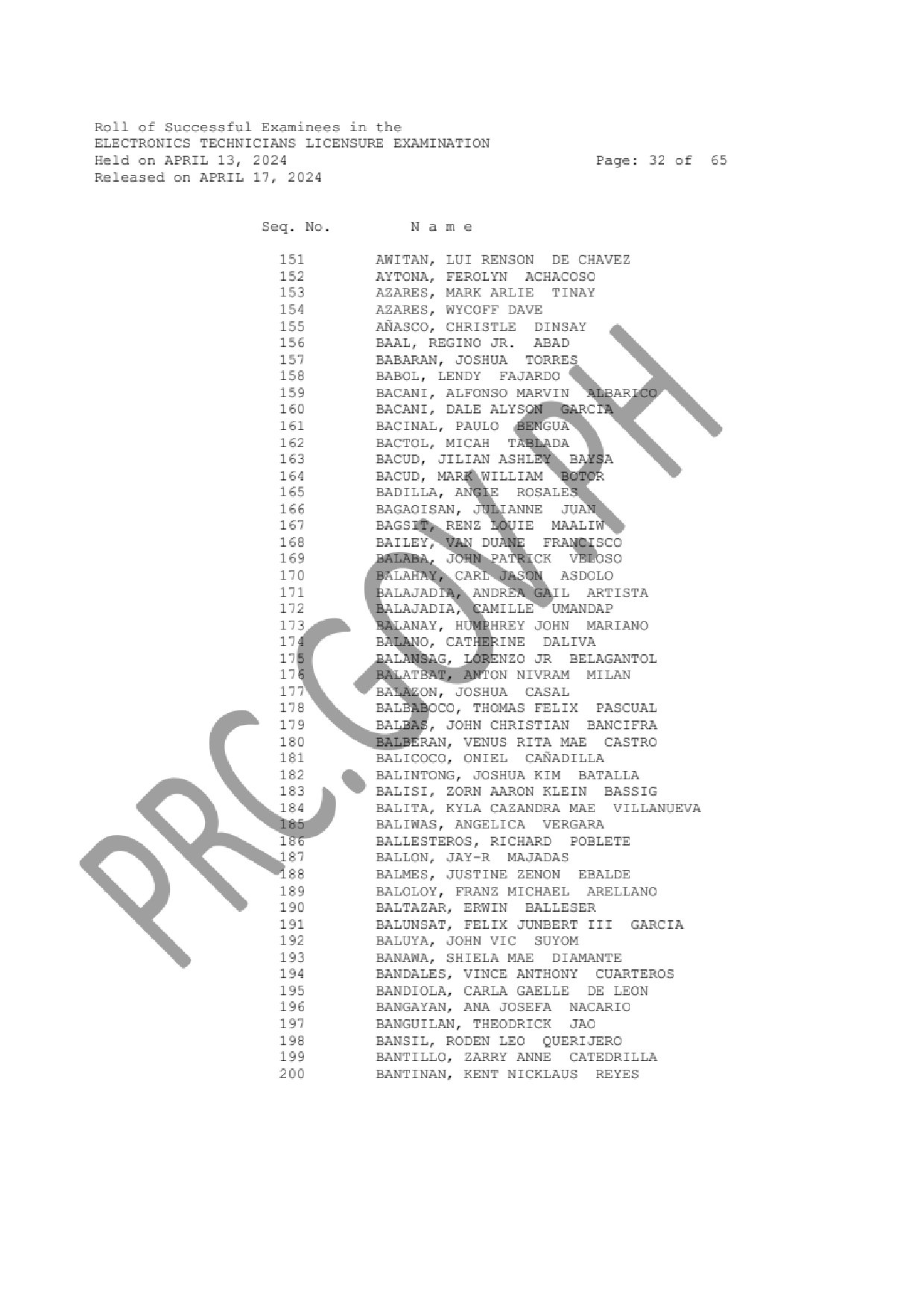 ECELE and ECTLE LIST OF PASSERS: The Professional Regulation Commission (PRC) announces that 1,330 out of 3,130 passed the Electronics Engineers Licensure Examination and 1,819 out of 2,538 passed the Electronics Technicians Licensure Examination given by the Board of Electronics Engineering in N. C. R., Baguio, Cagayan de Oro, Cebu, Davao, Iloilo, Legazpi, Lucena, Pampanga, Rosales and Tuguegarao this April 2024.