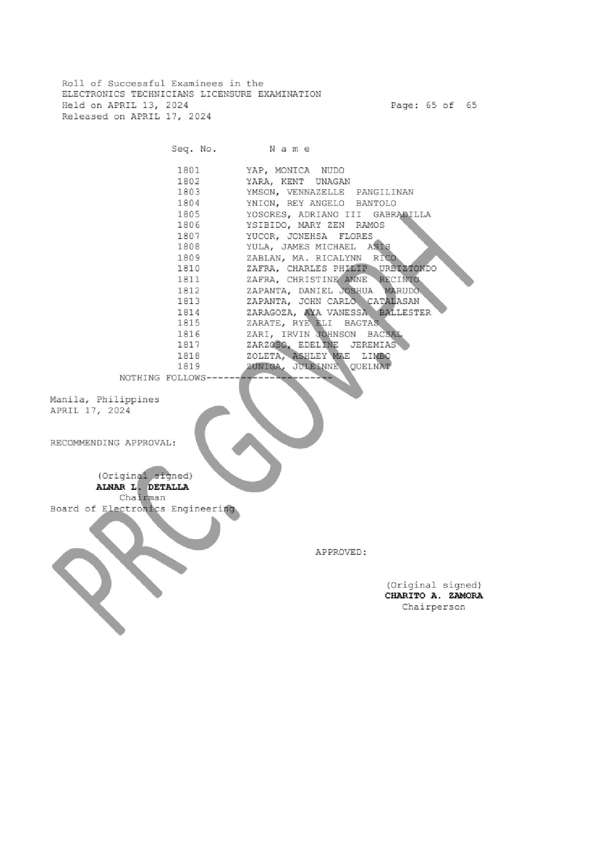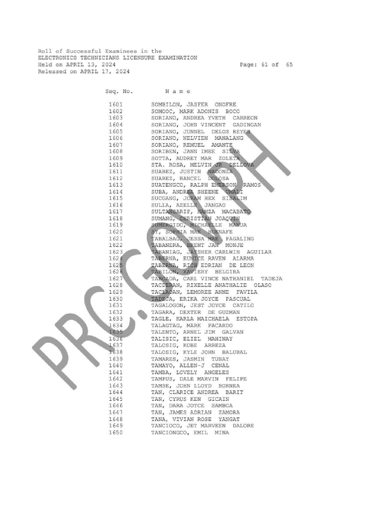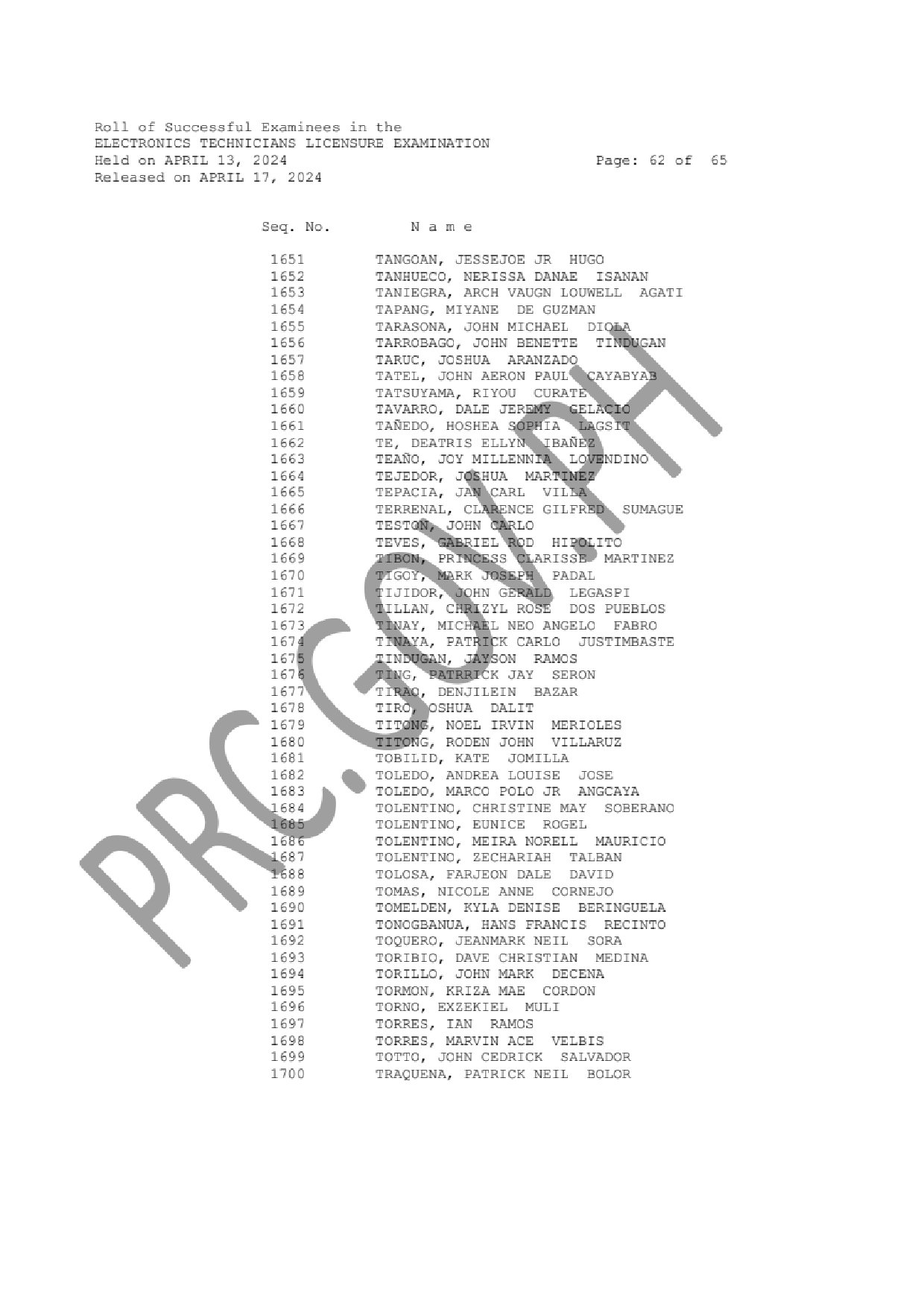 ECELE and ECTLE LIST OF PASSERS: The Professional Regulation Commission (PRC) announces that 1,330 out of 3,130 passed the Electronics Engineers Licensure Examination and 1,819 out of 2,538 passed the Electronics Technicians Licensure Examination given by the Board of Electronics Engineering in N. C. R., Baguio, Cagayan de Oro, Cebu, Davao, Iloilo, Legazpi, Lucena, Pampanga, Rosales and Tuguegarao this April 2024.