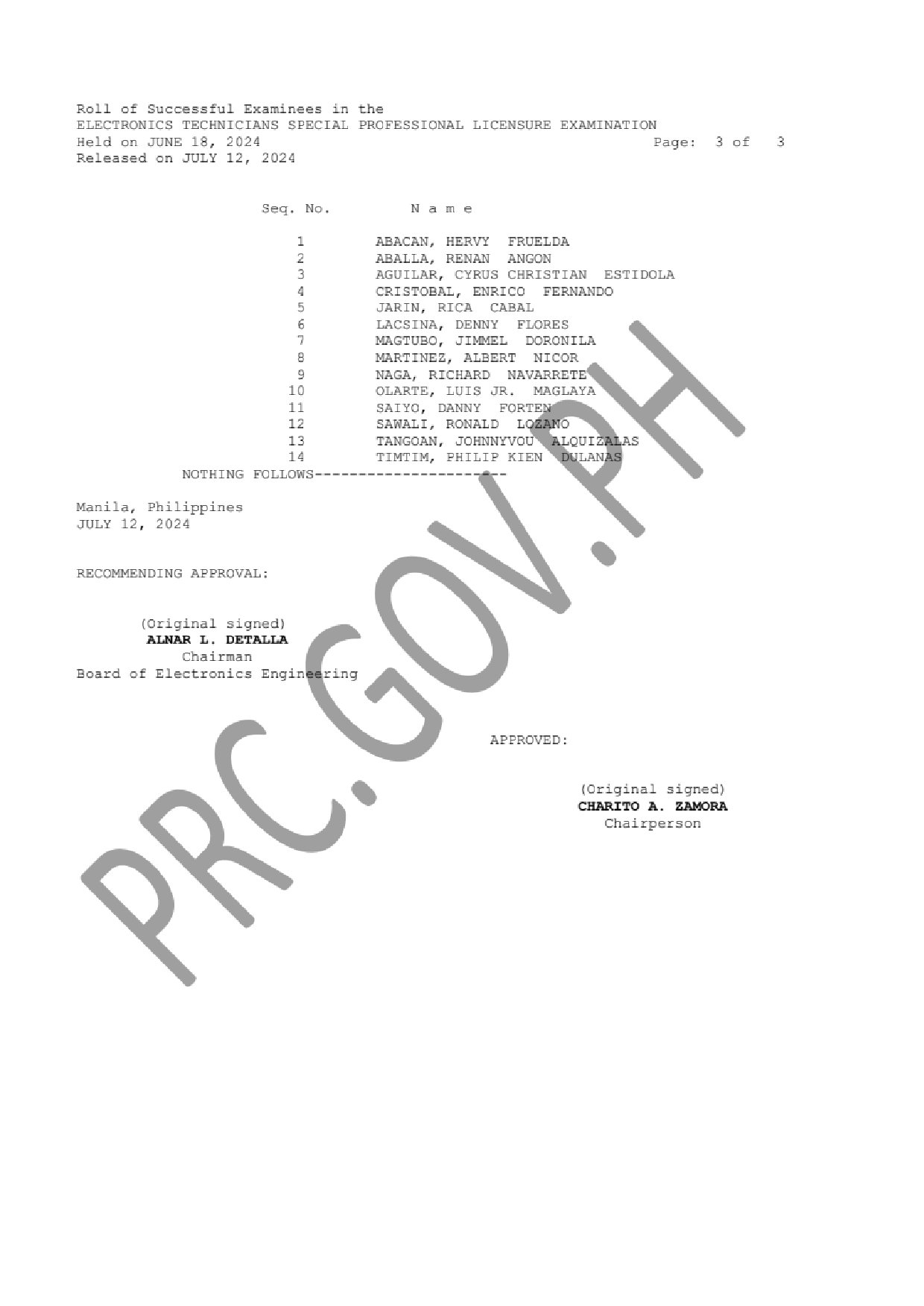 SPLE for ECE and ECT LIST OF PASSERS: The Professional Regulation Commission (PRC) announces that 12 out of 60 passed the Electronics Engineers Special Professional Licensure Examination and 14 out of 22 passed the Electronics Technicians Special Professional Licensure Examination given by the Board of Electronics Engineering in: Abu Dhabi and Dubai, United Arab Emirates; Al Ahmadi, Kuwait; Al-Khobar, Jeddah and Riyadh, Kingdom of Saudi Arabia; Doha, Qatar; Manama, Bahrain; and Singapore last June 2024.