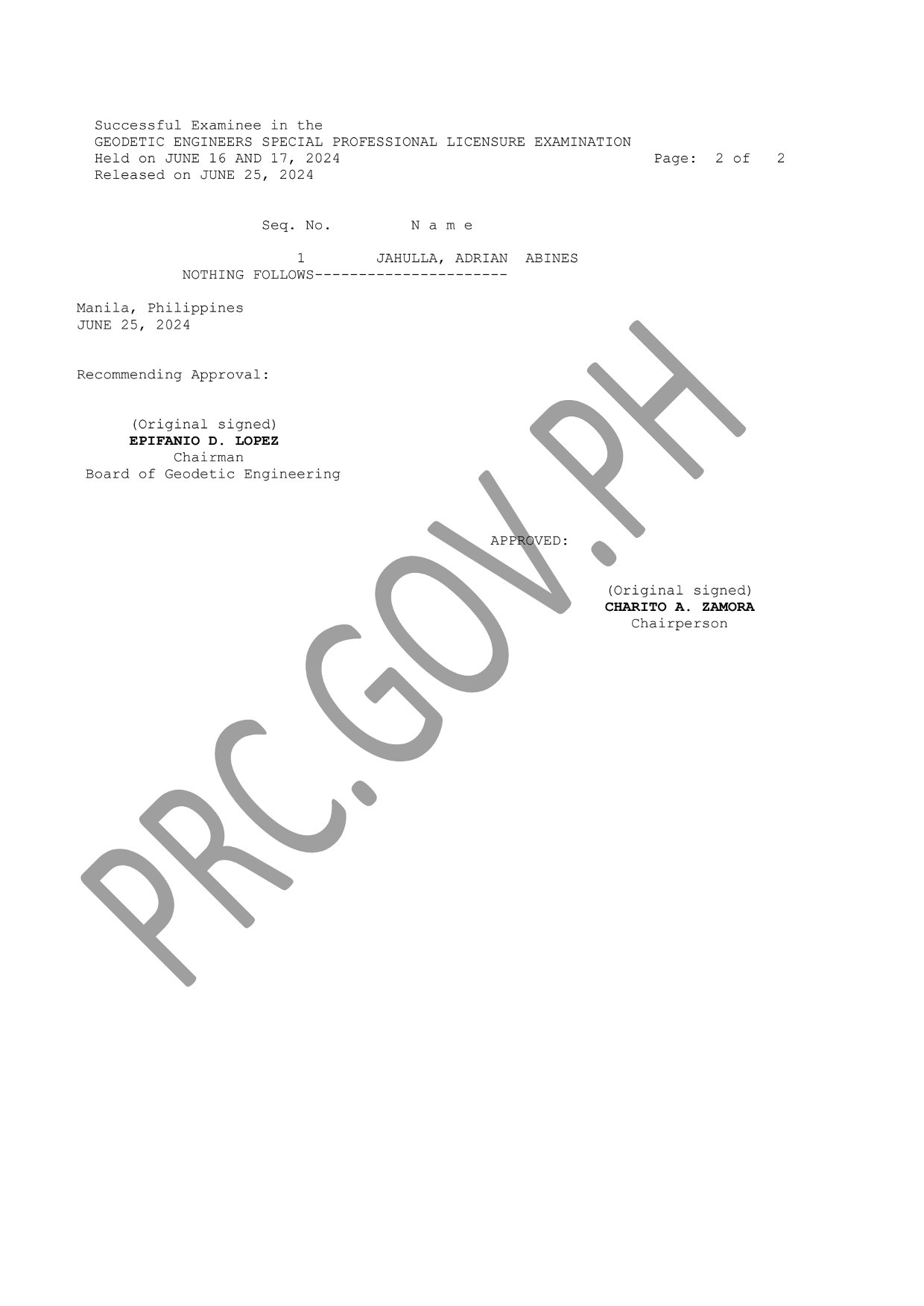 SPLE for Geodetic Engineers LIST OF PASSERS: The Professional Regulation Commission (PRC) announces that 1 out of 7 passed the Geodetic Engineers Special Professional Licensure Examination given by the Board of Geodetic Engineering in Doha, Qatar; Jeddah and Riyadh, Kingdom of Saudi Arabia this June 2024.