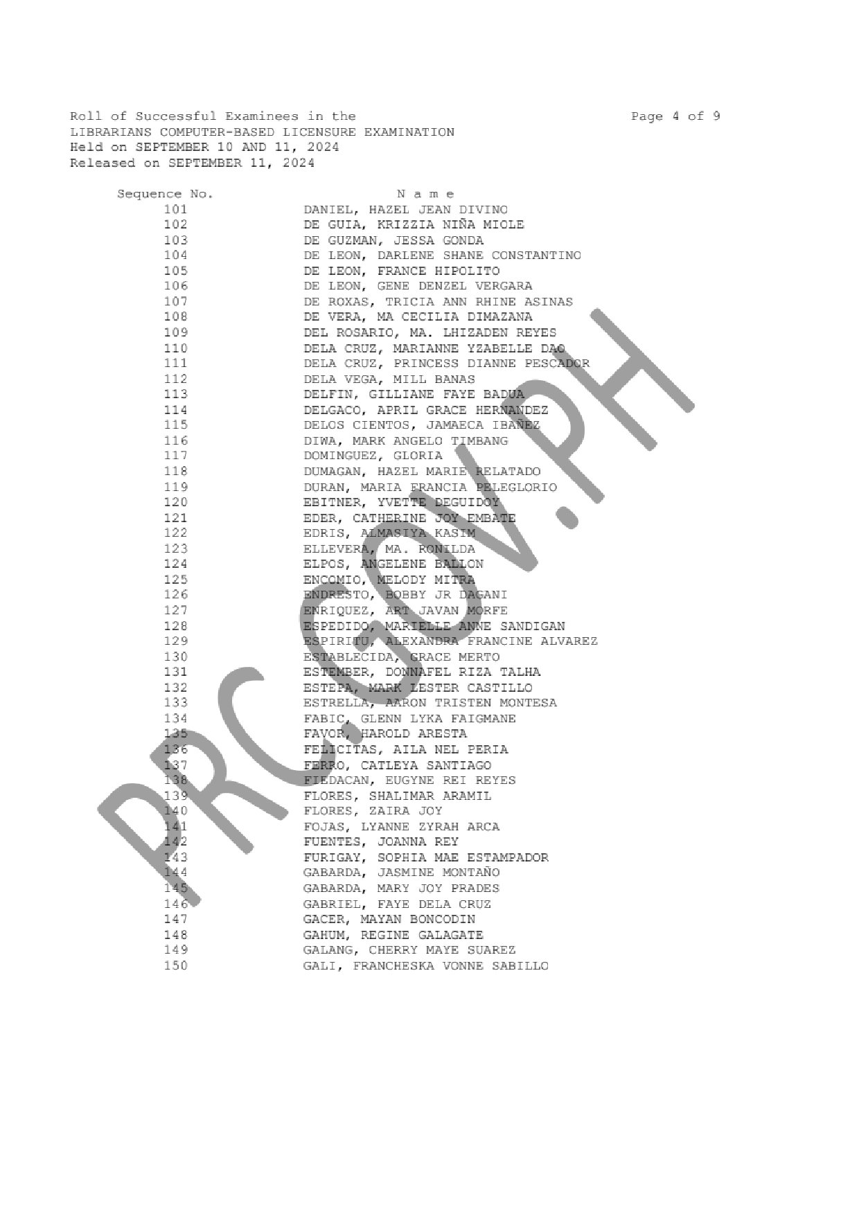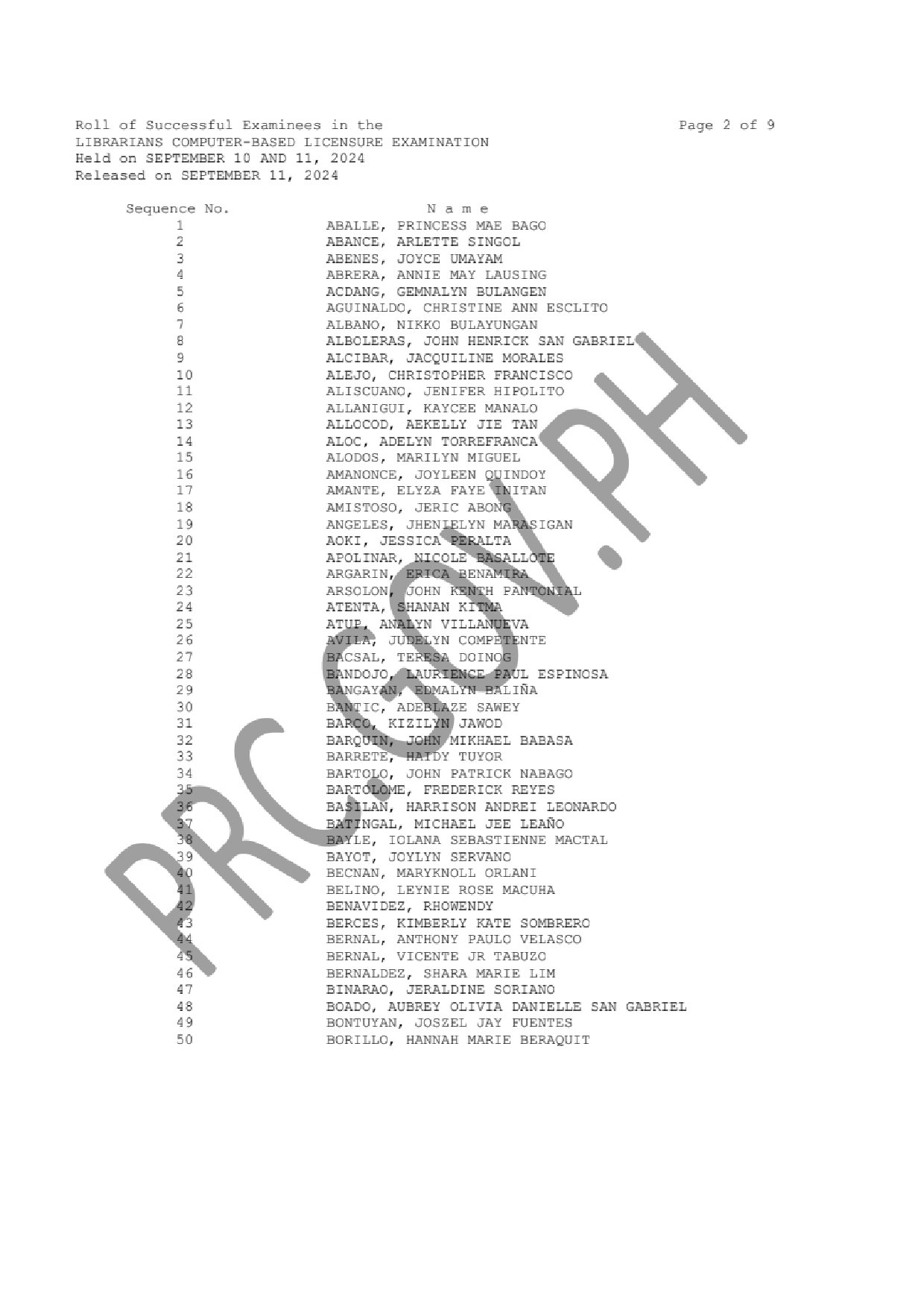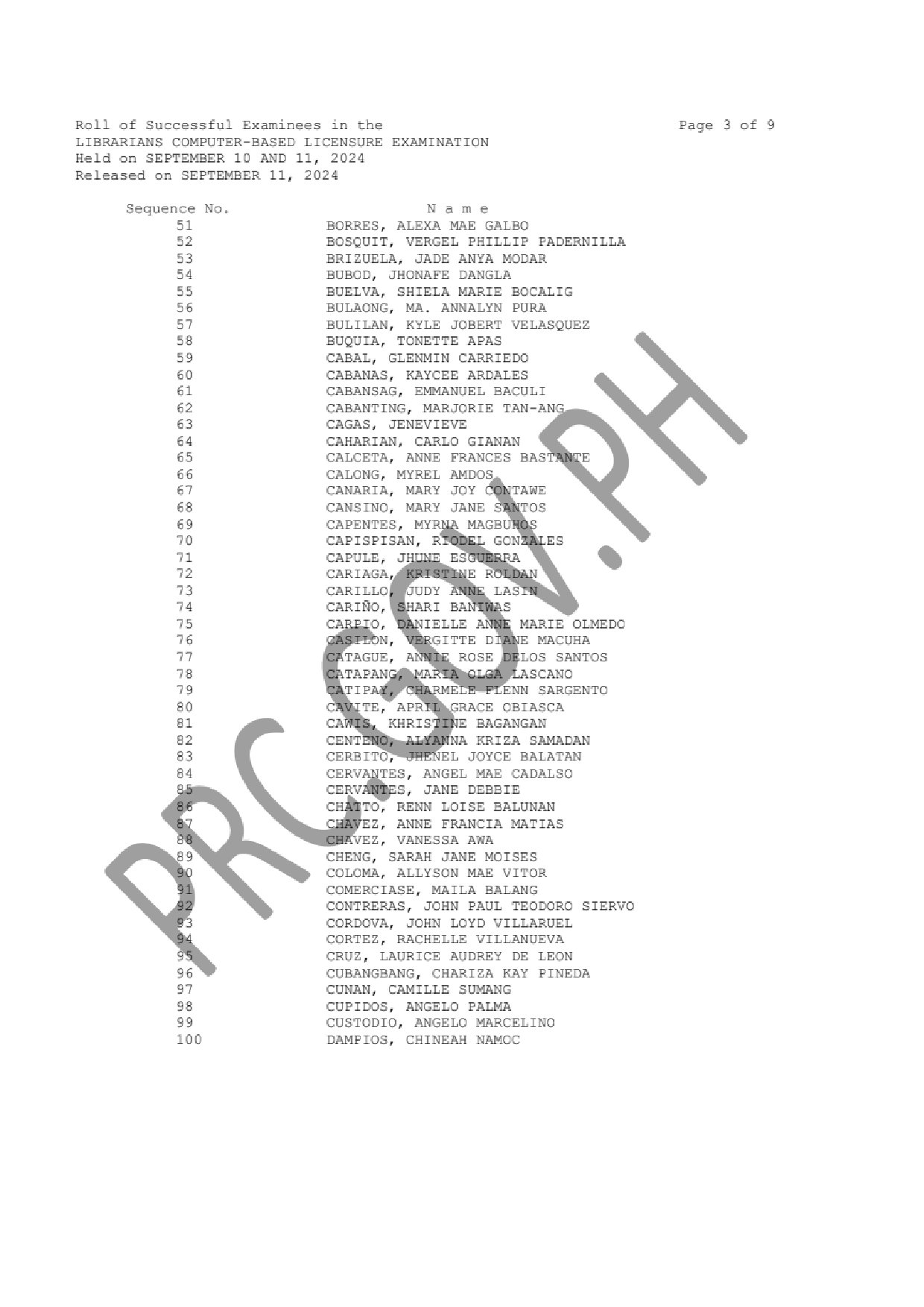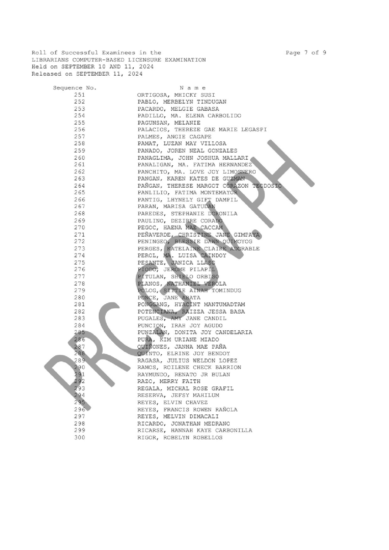LLE LIST OF PASSERS: The Professional Regulation Commission (PRC) announces that 376 out of 771 passed the Librarians Computer-Based Licensure Examination given by the Board for Librarians in N. C. R., Davao, Legazpi, Lucena and Rosales this September 2024.