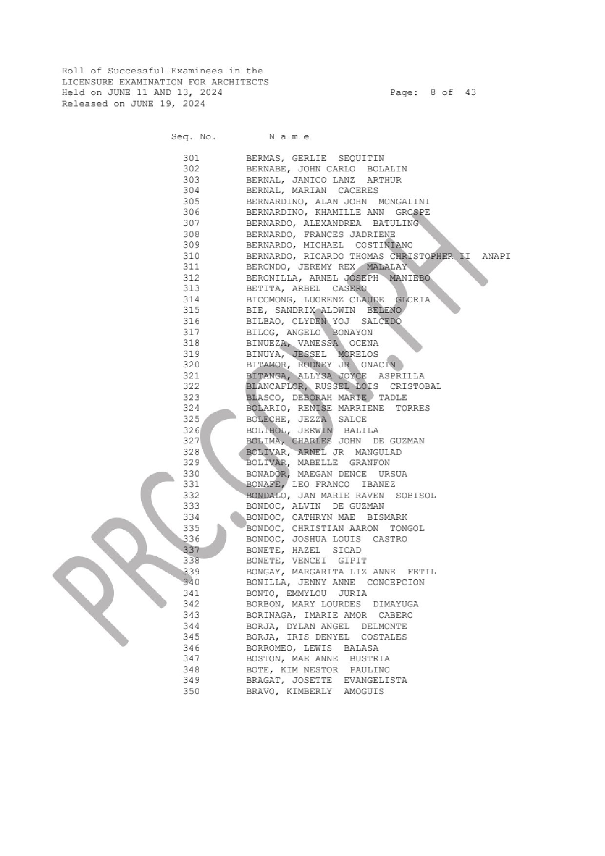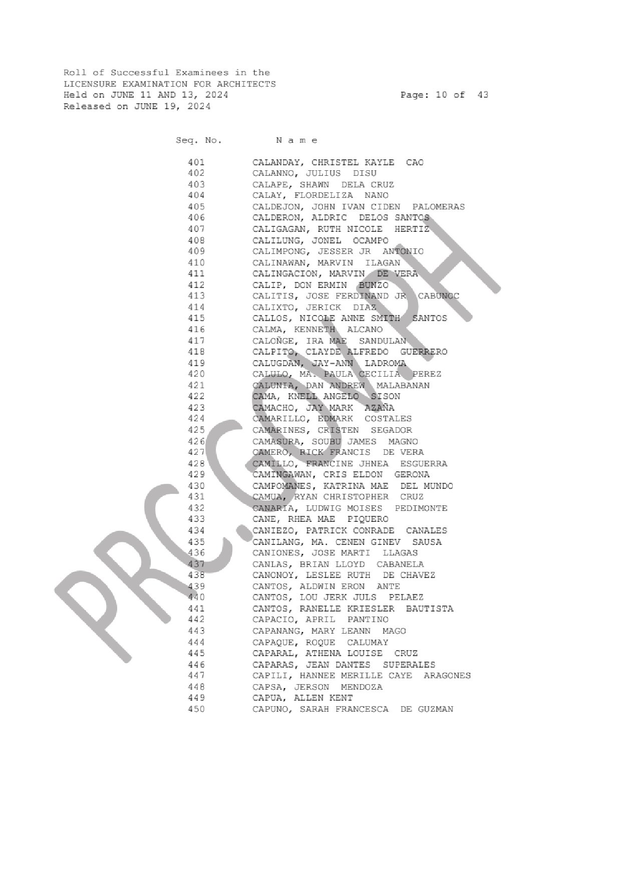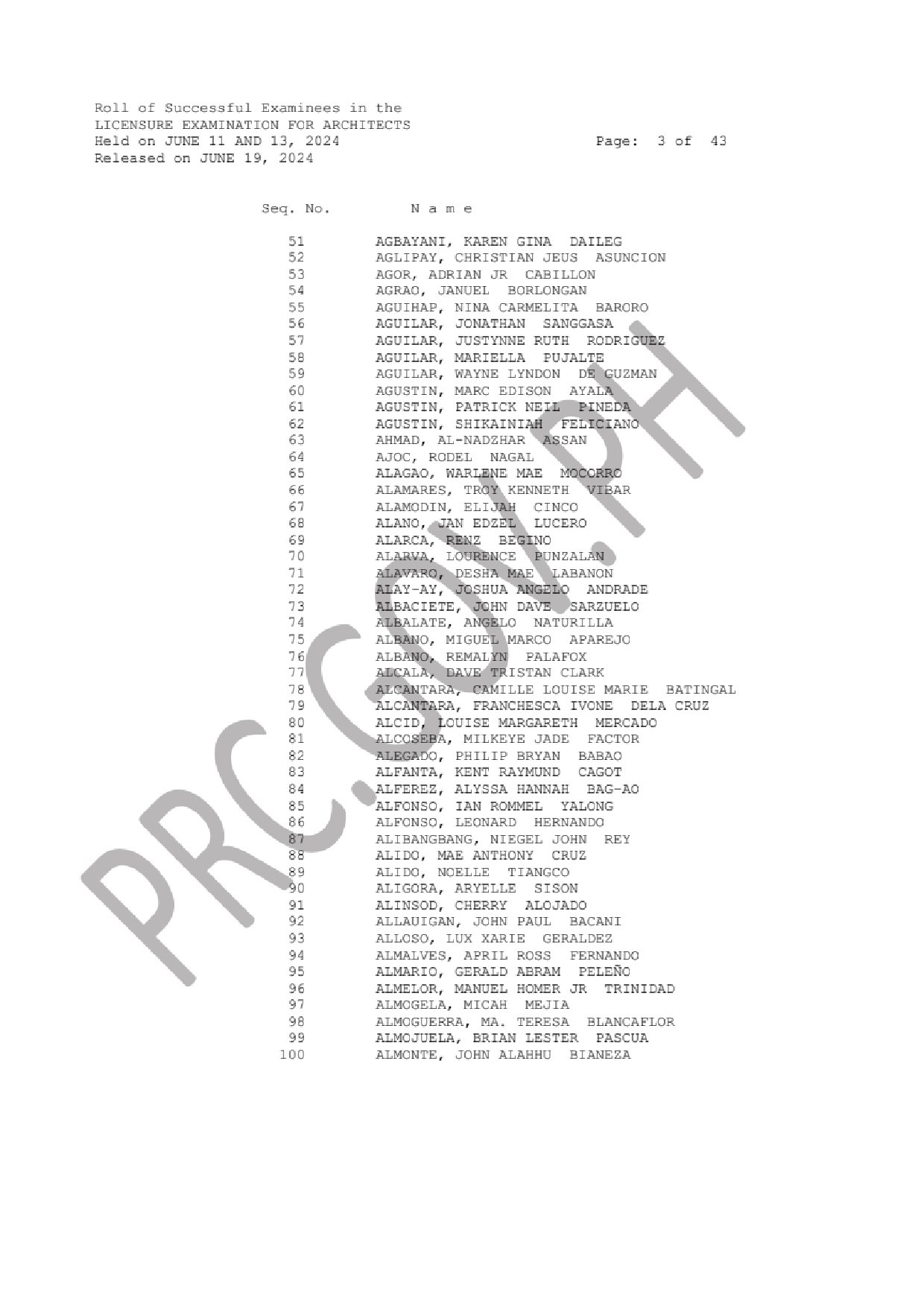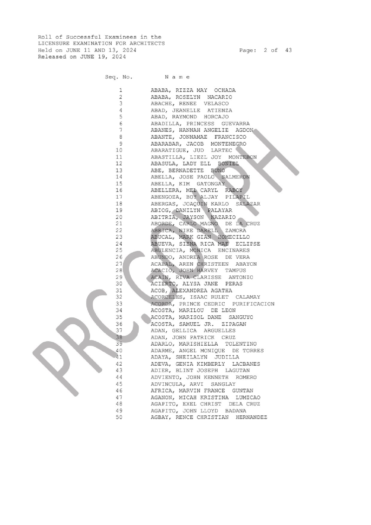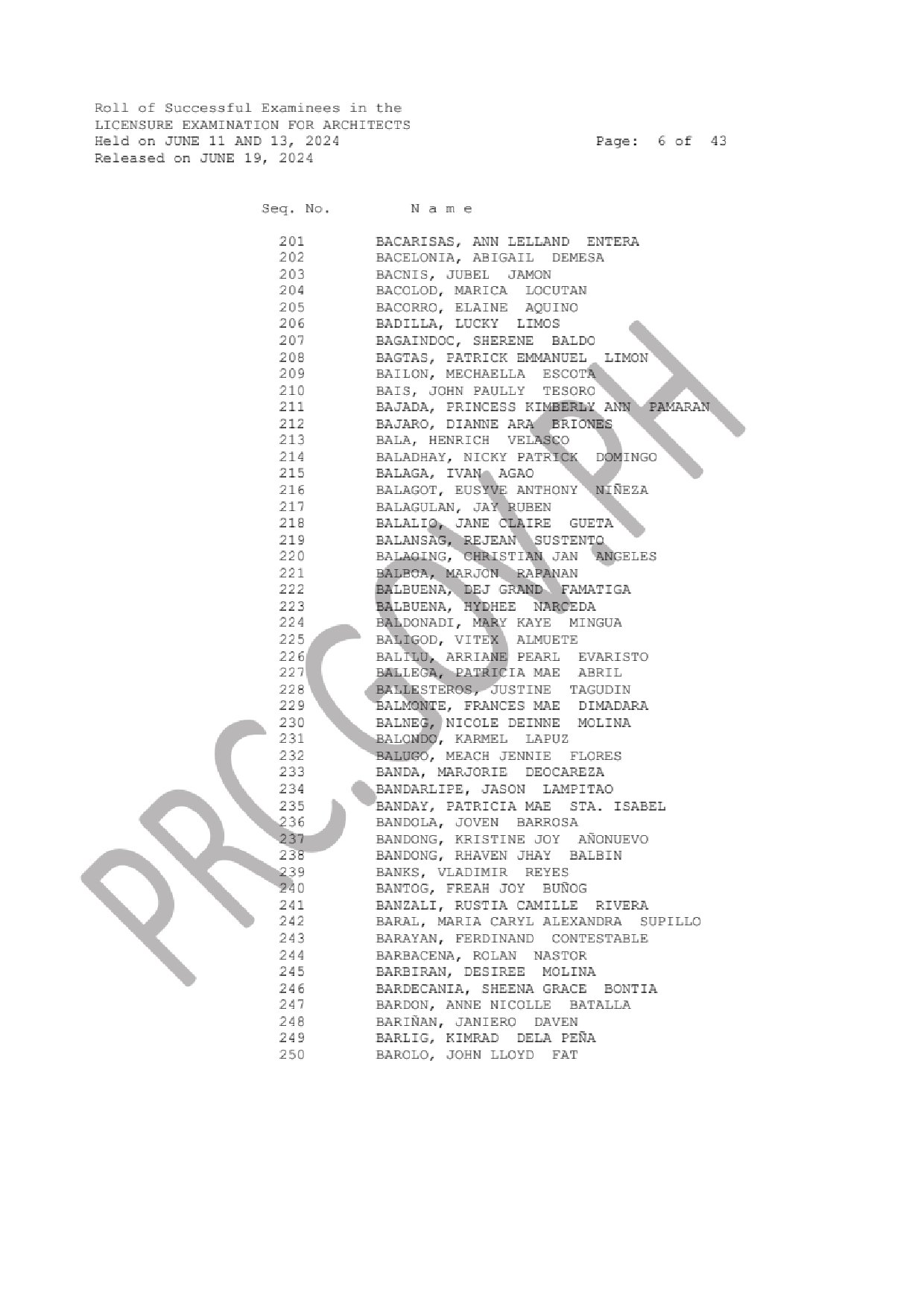 ALE LIST OF PASSERS: The Professional Regulation Commission (PRC) announces that 2,094 out of 3,370 passed the Licensure Examination for Architects (LEA) given by the Board of Architecture headed by its Chairman, Arch. Robert S. Sac with two other members, Arch. Robert M. Mirafuente and Arch. Corazon V. Fabia-Tandoc. The examination was held in N. C. R., Baguio, Cebu, Davao, Iloilo, Legazpi, Lucena, Pampanga, Rosales, Tacloban, Tuguegarao and Zamboanga this June 11 and 13, 2024.
