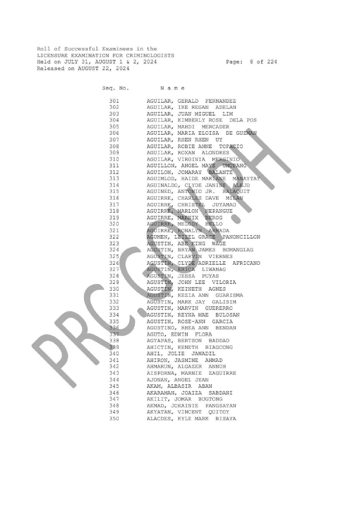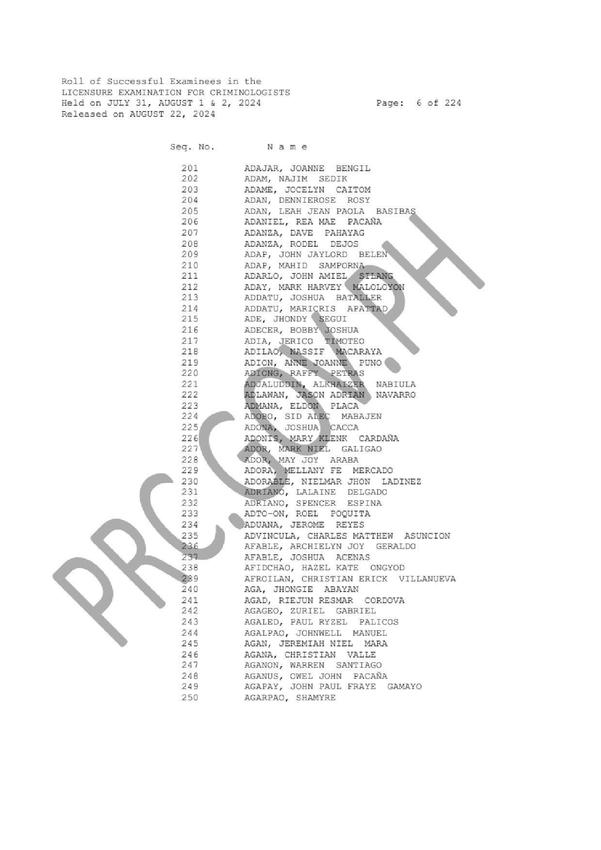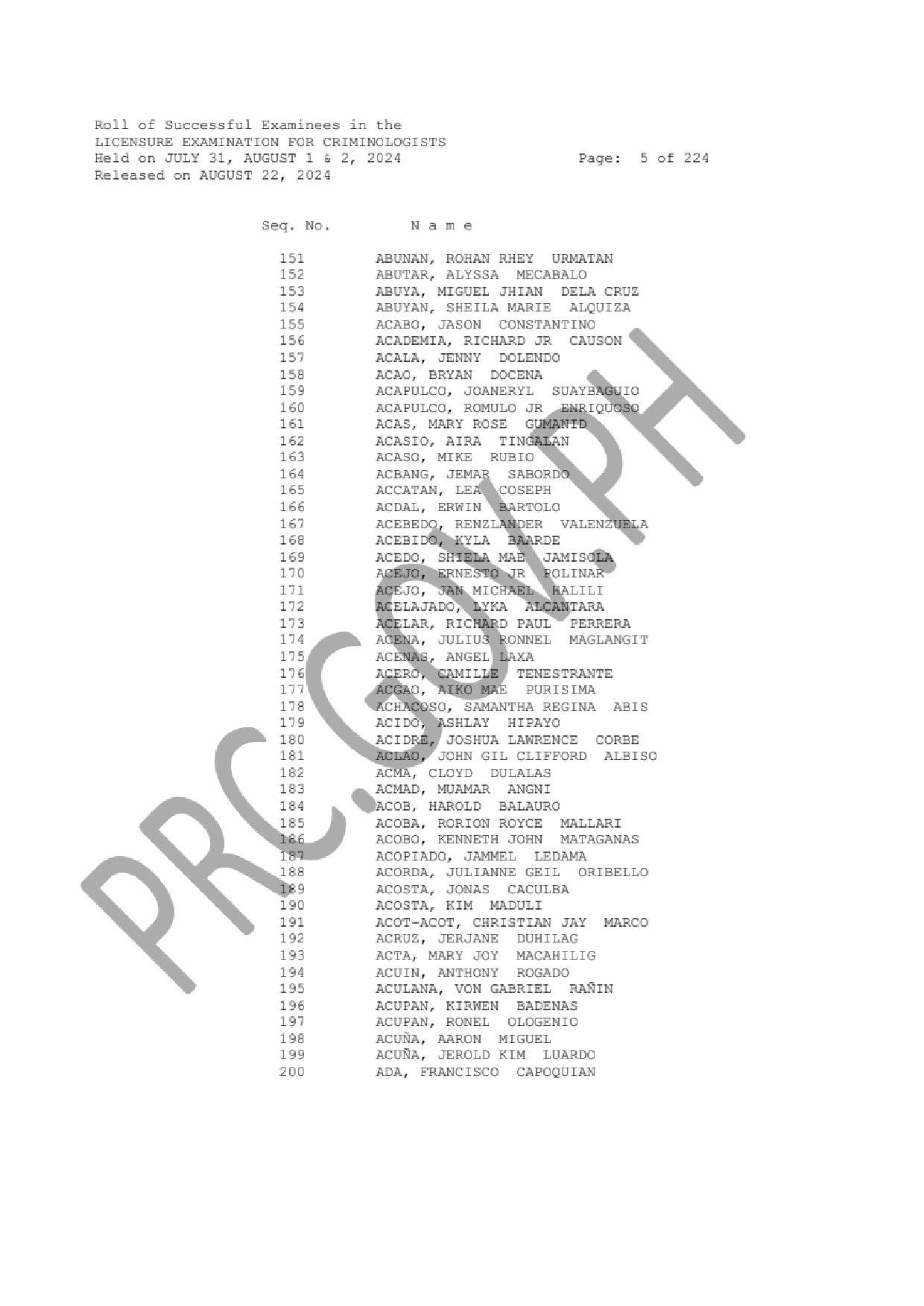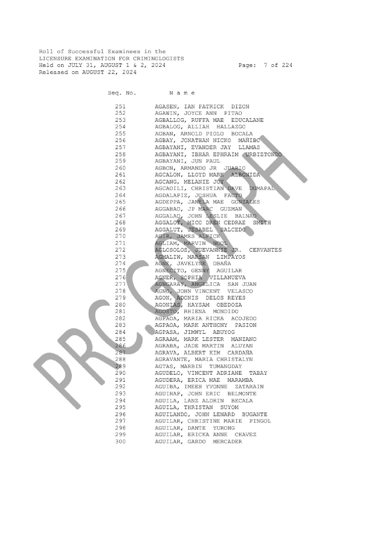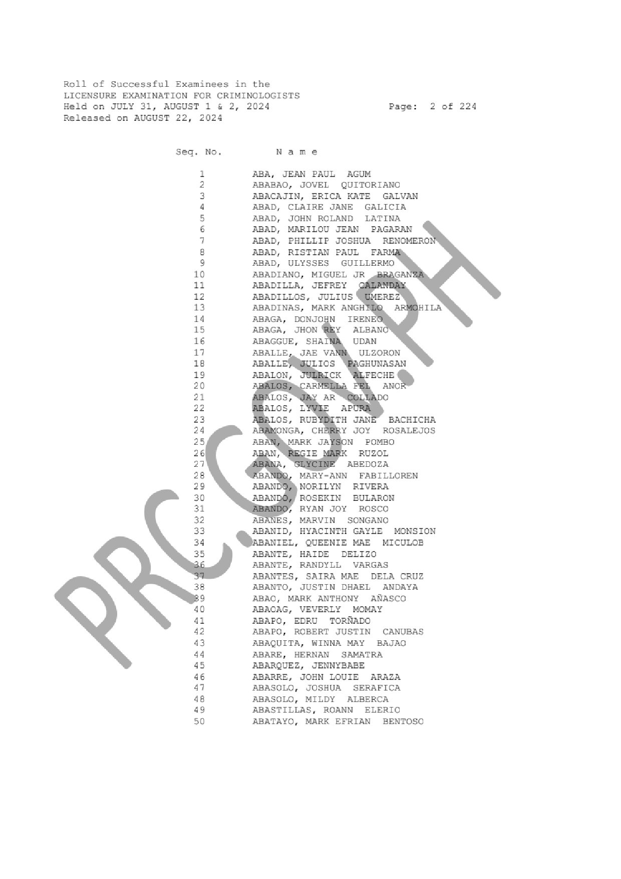 CLE LIST OF PASSERS: The Professional Regulation Commission (PRC) announces that 11,121 out of 22,539 passed the Licensure Examination for Criminologists given by the Board of Criminology last July 2024 in 22 testing centers all over the Philippines. The results of examination with respect to two (2) examinees were withheld pending final determination of their liabilities under the rules and regulations governing licensure examinations.