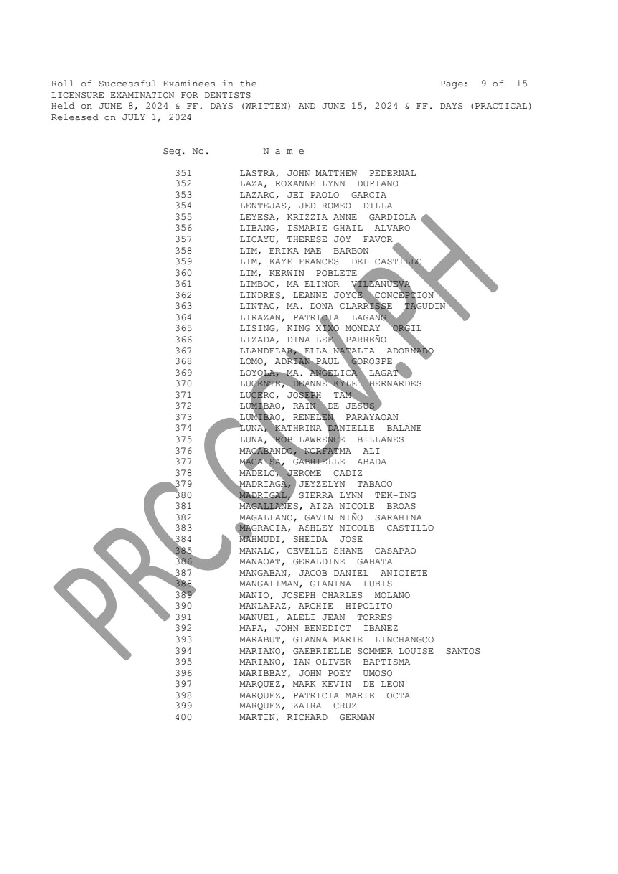 LIST OF PASSERS: The Professional Regulation Commission (PRC) announces that 673 out of 1,207 passed the Licensure Examination for Dentists given by the Board of Dentistry in N. C. R., Baguio and Cebu last June 2024.