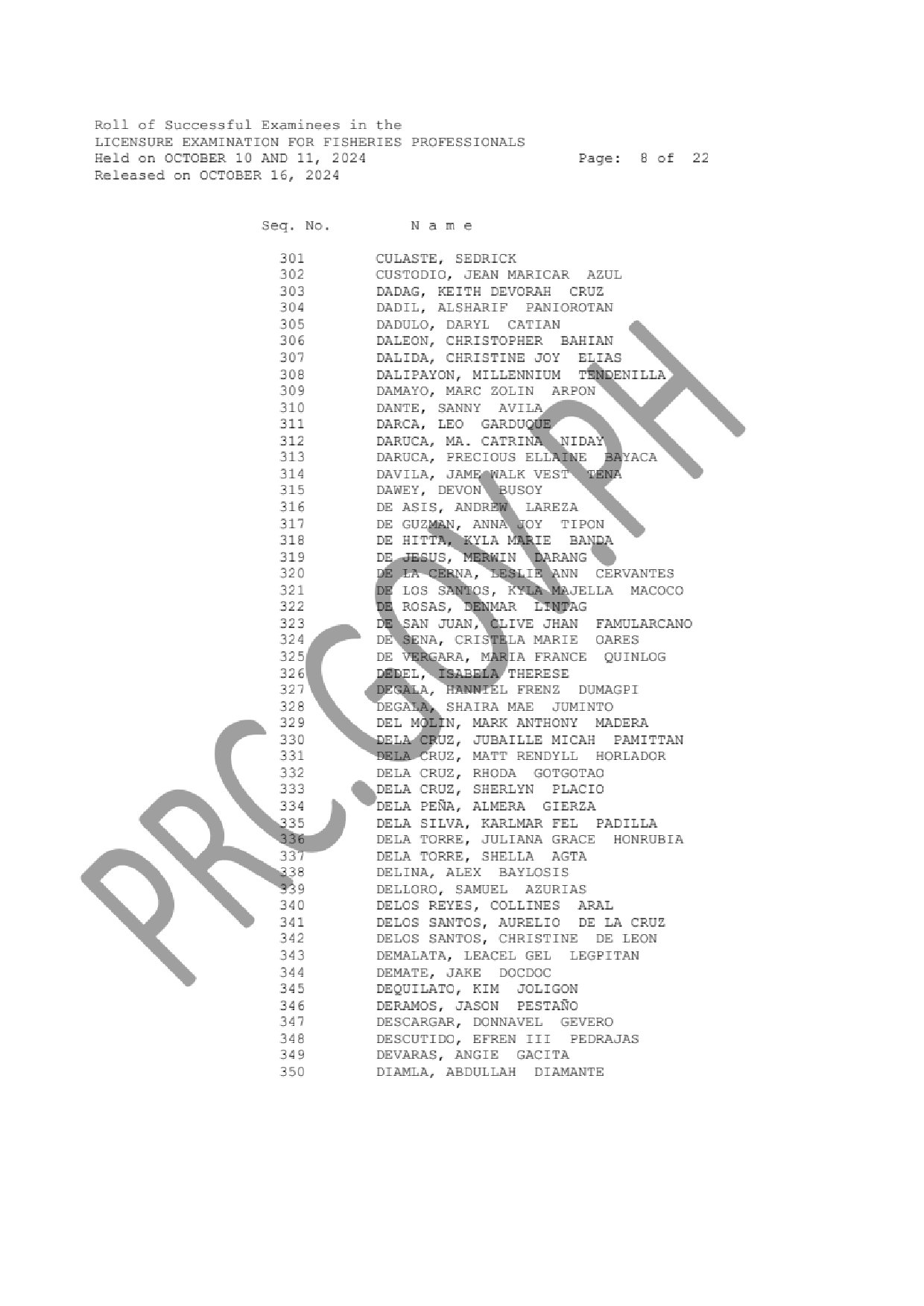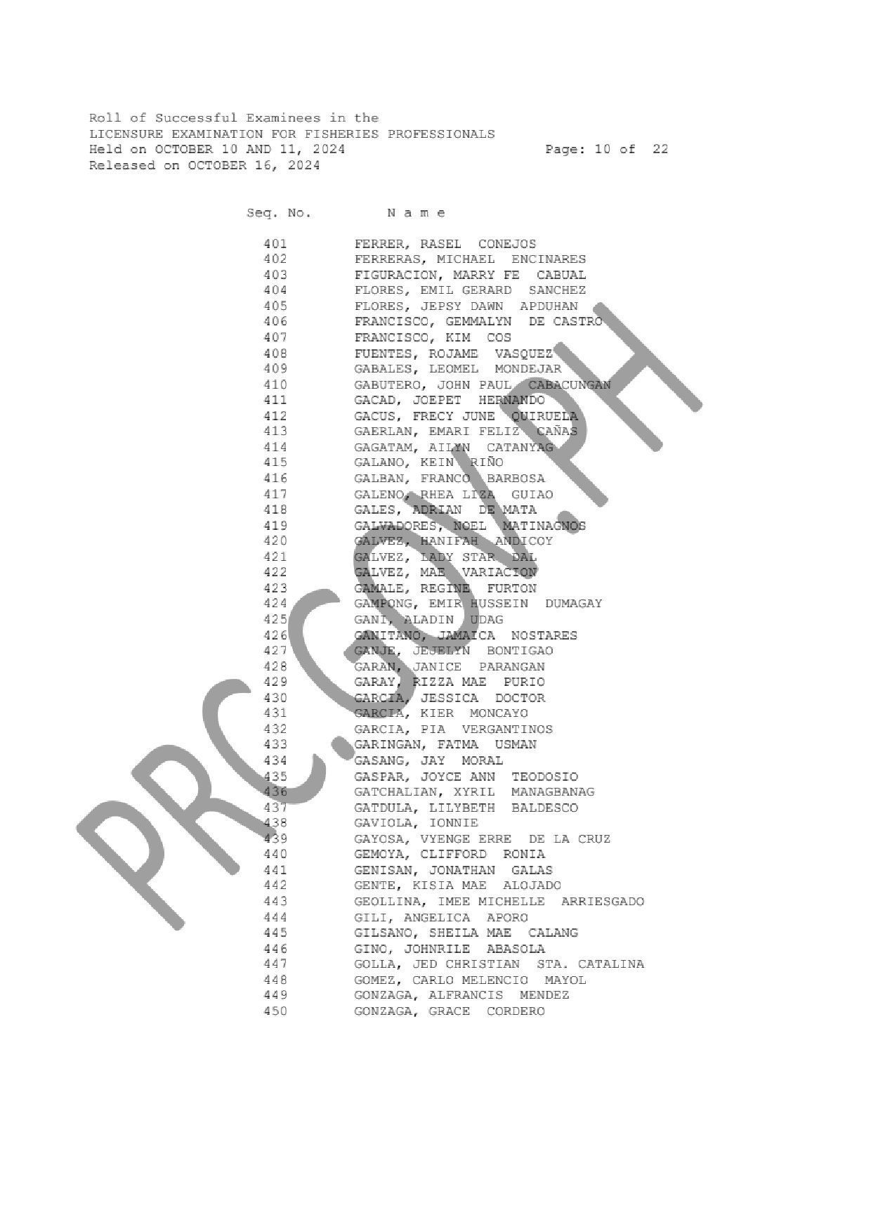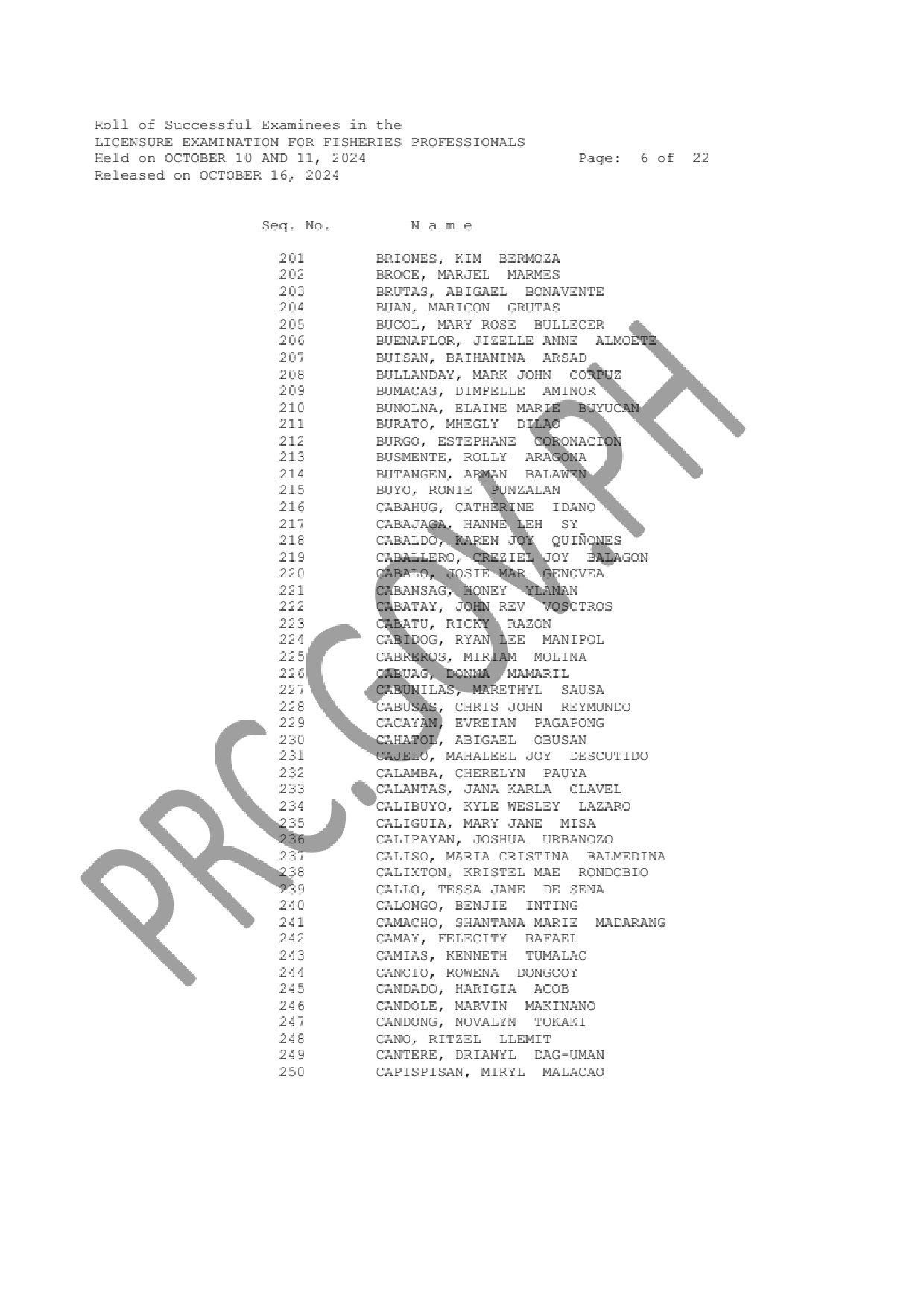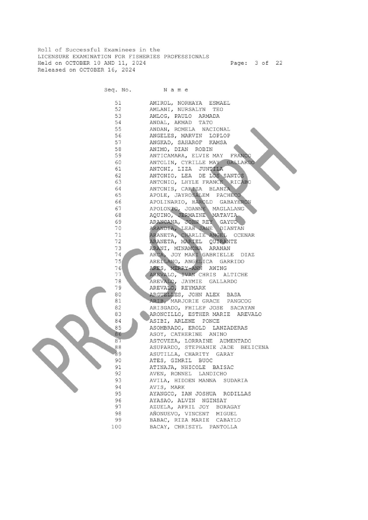 Fisheries Professionals LIST OF PASSERS: The Professional Regulation Commission (PRC) announces that 1,005 out of 1,509 passed the Licensure Examination for Fisheries Professionals given by the Board of Fisheries in N. C. R., Baguio, Butuan, Cagayan de Oro, Cebu, Davao, Iloilo, Koronadal, Legazpi, Lucena, Pagadian, Rosales, Tacloban, Tuguegarao, Zamboanga and Puerto Princesa, Palawan this October 2024.