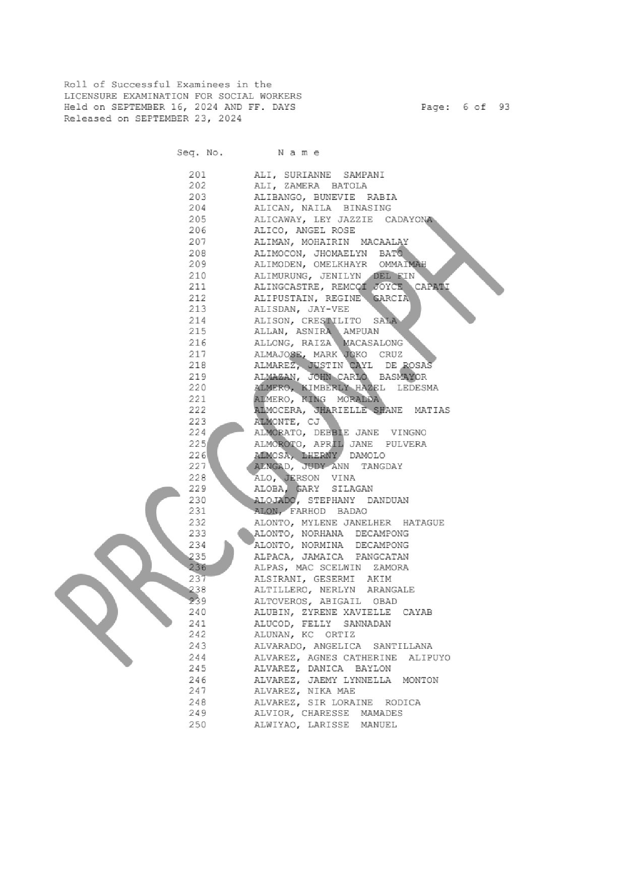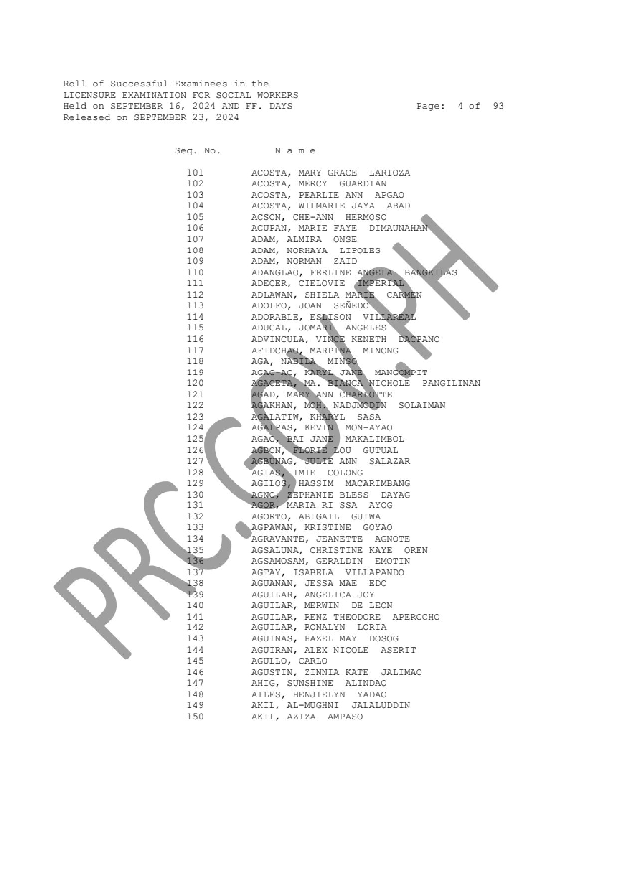 SWLE LIST OF PASSERS: The Professional Regulation Commission (PRC) announces that 4,587 out of 7,113 passed the Licensure Examination for Social Workers given by the Board for Social Workers in N. C. R., Baguio, Cebu and Davao this September 2024. The result of examination with respect to one (1) examinee was withheld pending completion of the remaining subject in the licensure examination.
