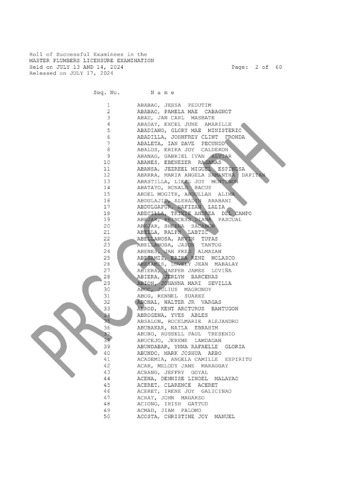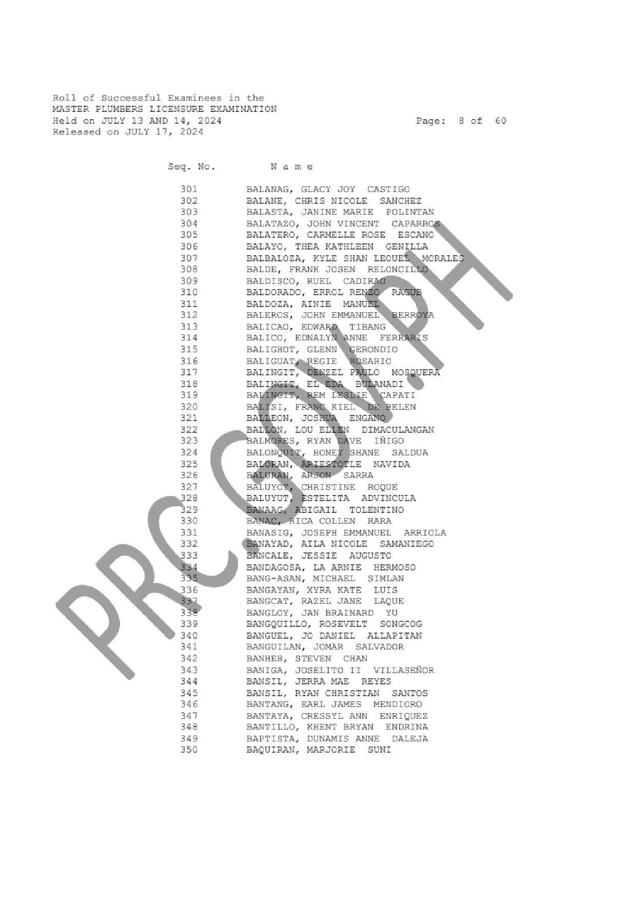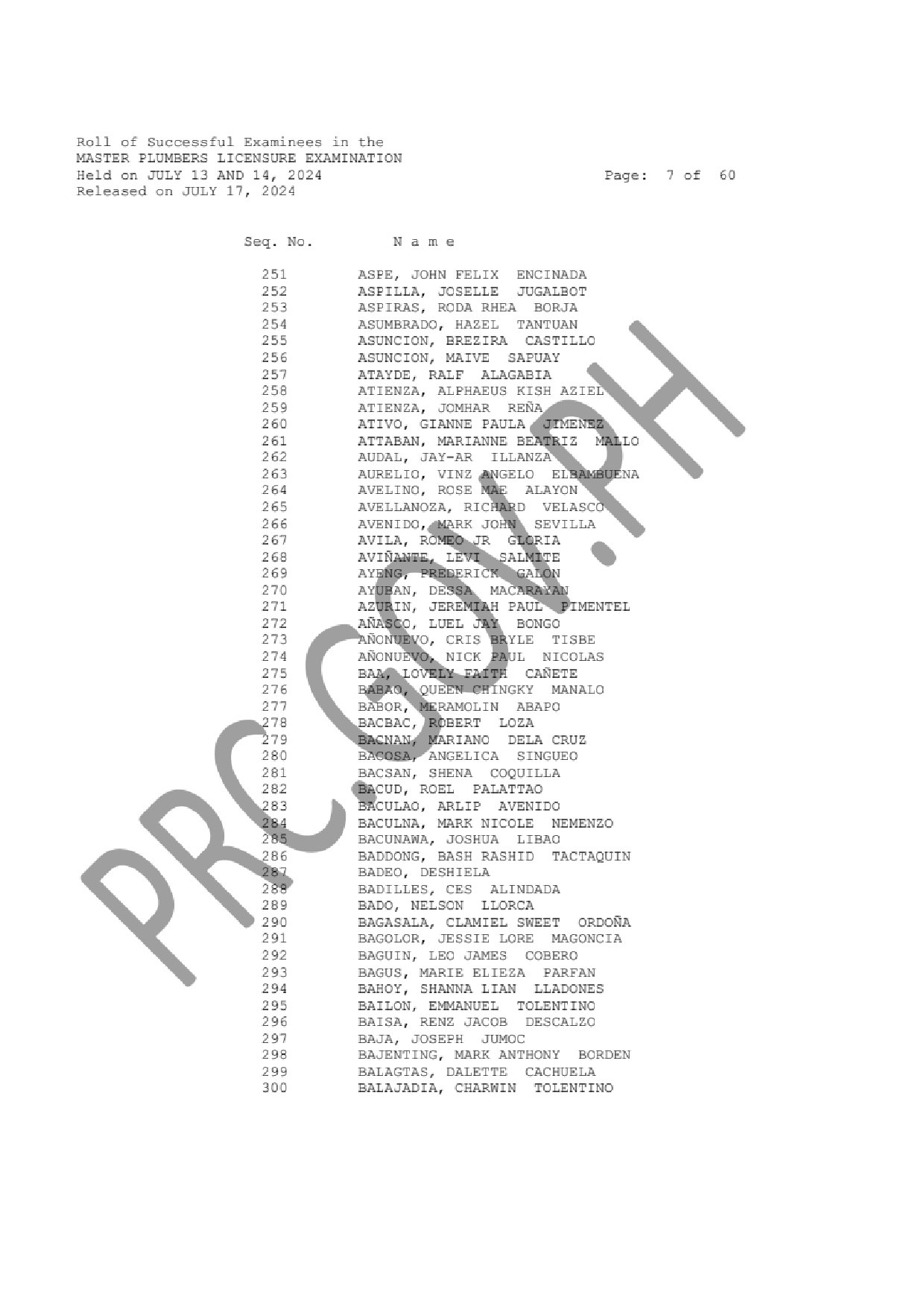 MPLE LIST OF PASSERS: The Professional Regulation Commission (PRC) announces that 2,936 out of 6,191 passed the Master Plumbers Licensure Examination given by the Board for Master Plumbers in N. C. R., Baguio, Butuan, Cagayan de Oro, Cebu, Davao, Iloilo, Koronadal, Legazpi, Lucena, Rosales, Tacloban and Puerto Princesa, Palawan this July 2024. The result of examination with respect to one (1) examinee was withheld pending final determination of his/her liabilities under the rules and regulations governing licensure examinations.