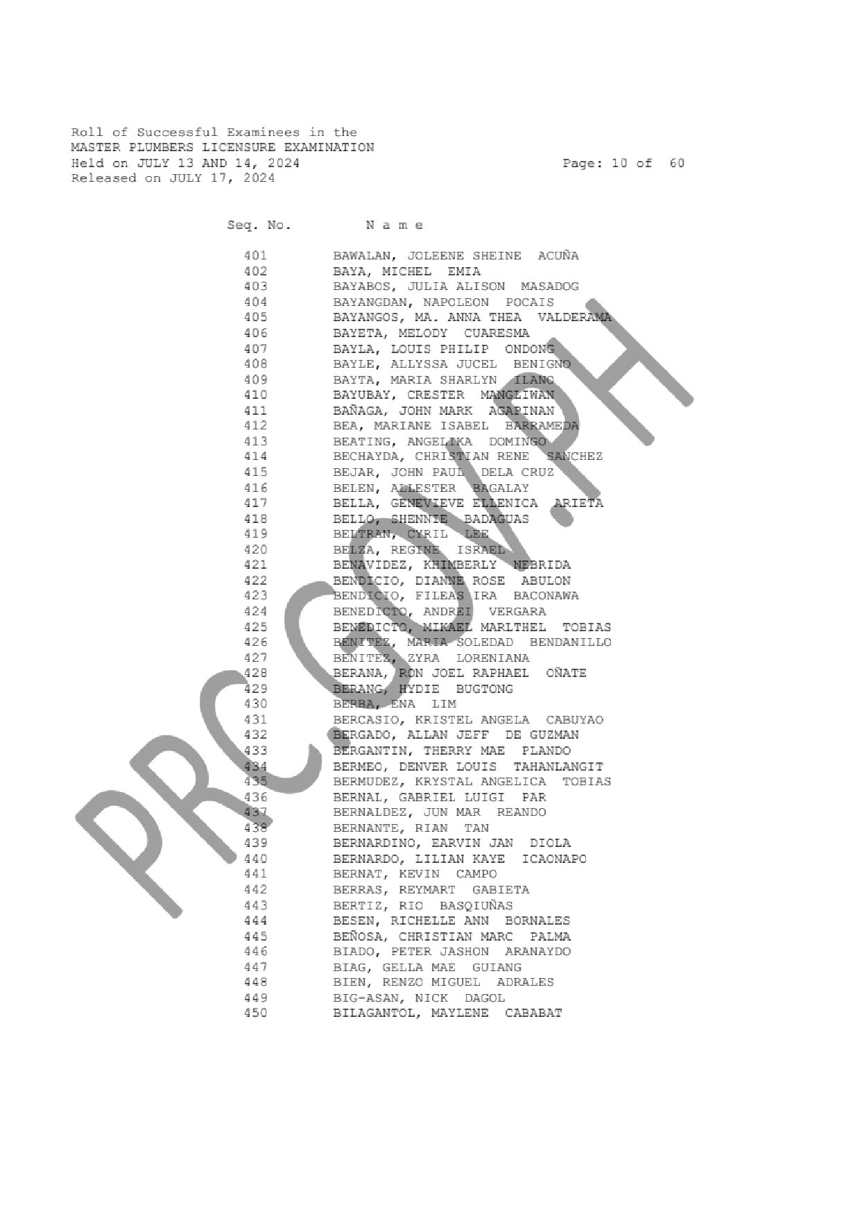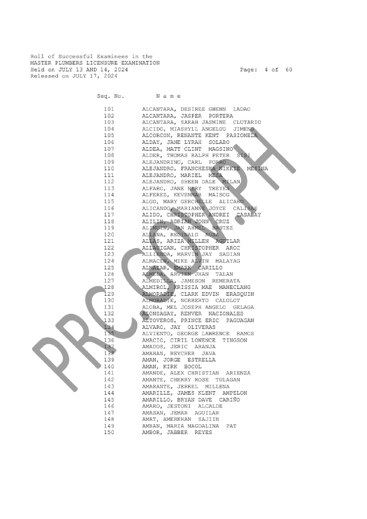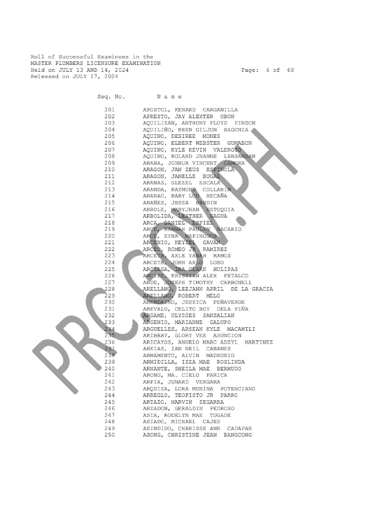MPLE LIST OF PASSERS: The Professional Regulation Commission (PRC) announces that 2,936 out of 6,191 passed the Master Plumbers Licensure Examination given by the Board for Master Plumbers in N. C. R., Baguio, Butuan, Cagayan de Oro, Cebu, Davao, Iloilo, Koronadal, Legazpi, Lucena, Rosales, Tacloban and Puerto Princesa, Palawan this July 2024. The result of examination with respect to one (1) examinee was withheld pending final determination of his/her liabilities under the rules and regulations governing licensure examinations.