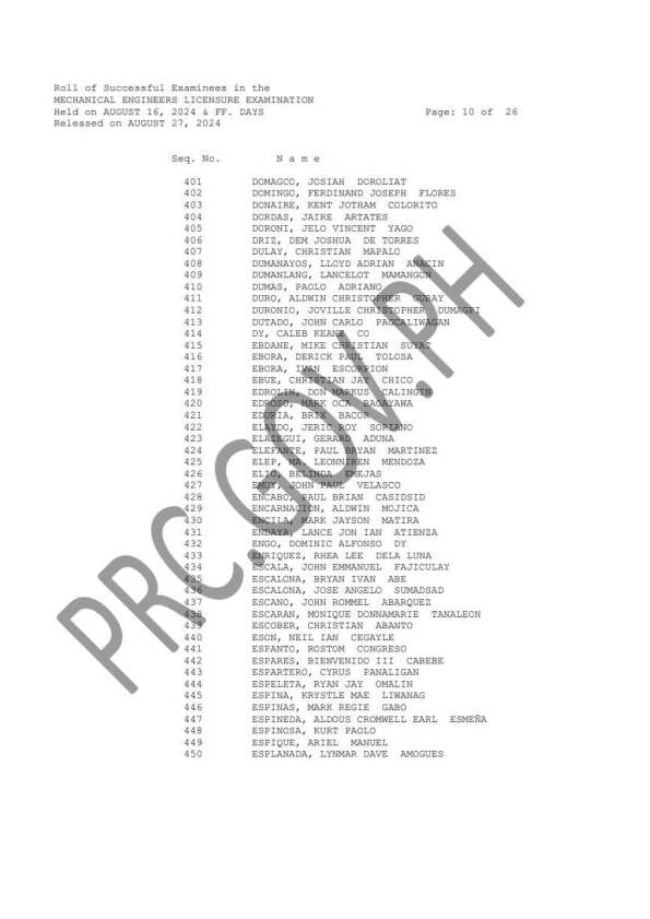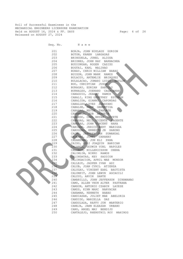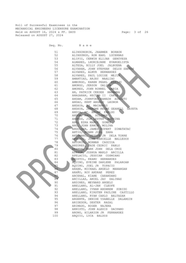 MELE & CPMLE LIST OF PASSERS: The Professional Regulation Commission (PRC) announces that 1,144 out of 3,485 passed the Mechanical Engineers Licensure Examination and 56 out of 113 passed the Certified Plant Mechanics (Computer-Based and Paper & Pencil) Licensure Examination given by the Board of Mechanical Engineering in N. C. R., Baguio, Cebu and Davao this August 2024. The result of examination with respect to one (1) examinee was withheld pending final determination of his/her liabilities under the rules and regulations governing licensure examinations.