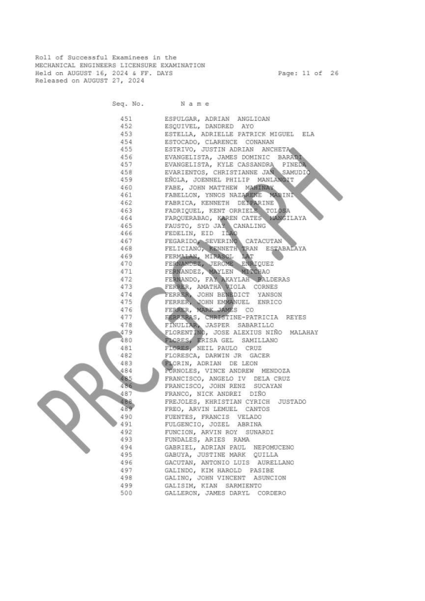 MELE & CPMLE LIST OF PASSERS: The Professional Regulation Commission (PRC) announces that 1,144 out of 3,485 passed the Mechanical Engineers Licensure Examination and 56 out of 113 passed the Certified Plant Mechanics (Computer-Based and Paper & Pencil) Licensure Examination given by the Board of Mechanical Engineering in N. C. R., Baguio, Cebu and Davao this August 2024. The result of examination with respect to one (1) examinee was withheld pending final determination of his/her liabilities under the rules and regulations governing licensure examinations.