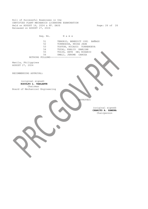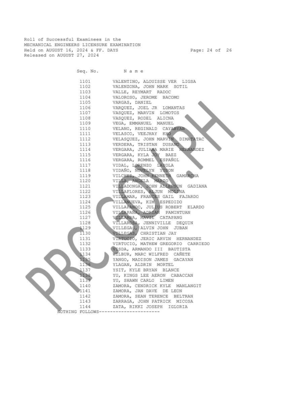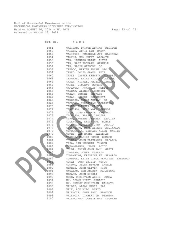 MELE & CPMLE LIST OF PASSERS: The Professional Regulation Commission (PRC) announces that 1,144 out of 3,485 passed the Mechanical Engineers Licensure Examination and 56 out of 113 passed the Certified Plant Mechanics (Computer-Based and Paper & Pencil) Licensure Examination given by the Board of Mechanical Engineering in N. C. R., Baguio, Cebu and Davao this August 2024. The result of examination with respect to one (1) examinee was withheld pending final determination of his/her liabilities under the rules and regulations governing licensure examinations.