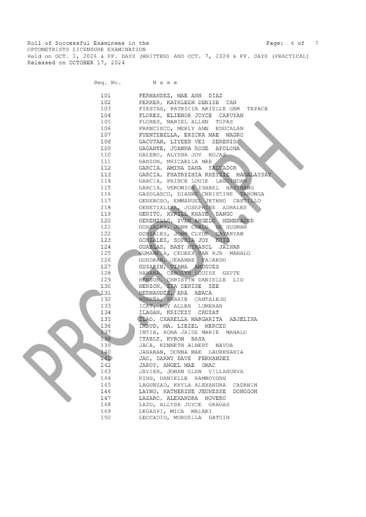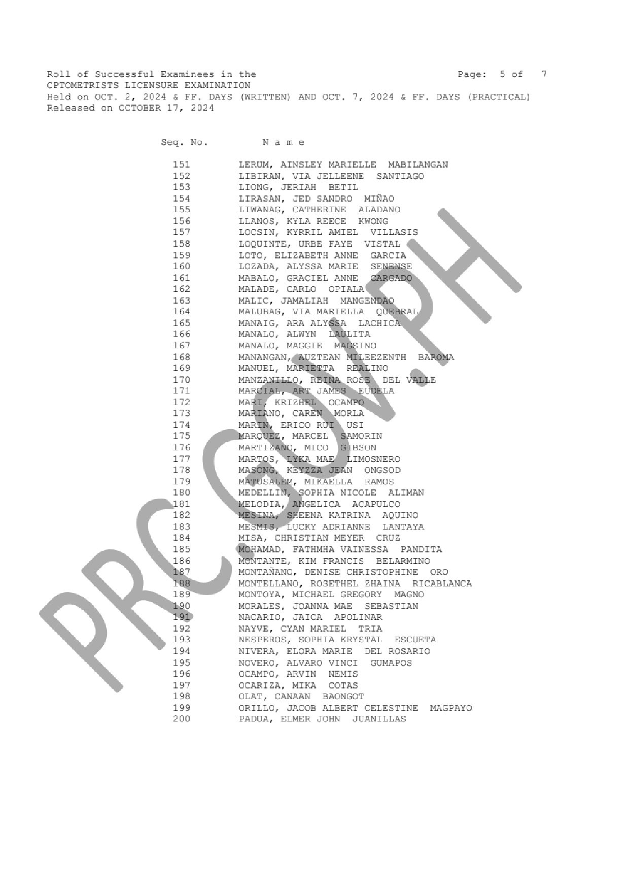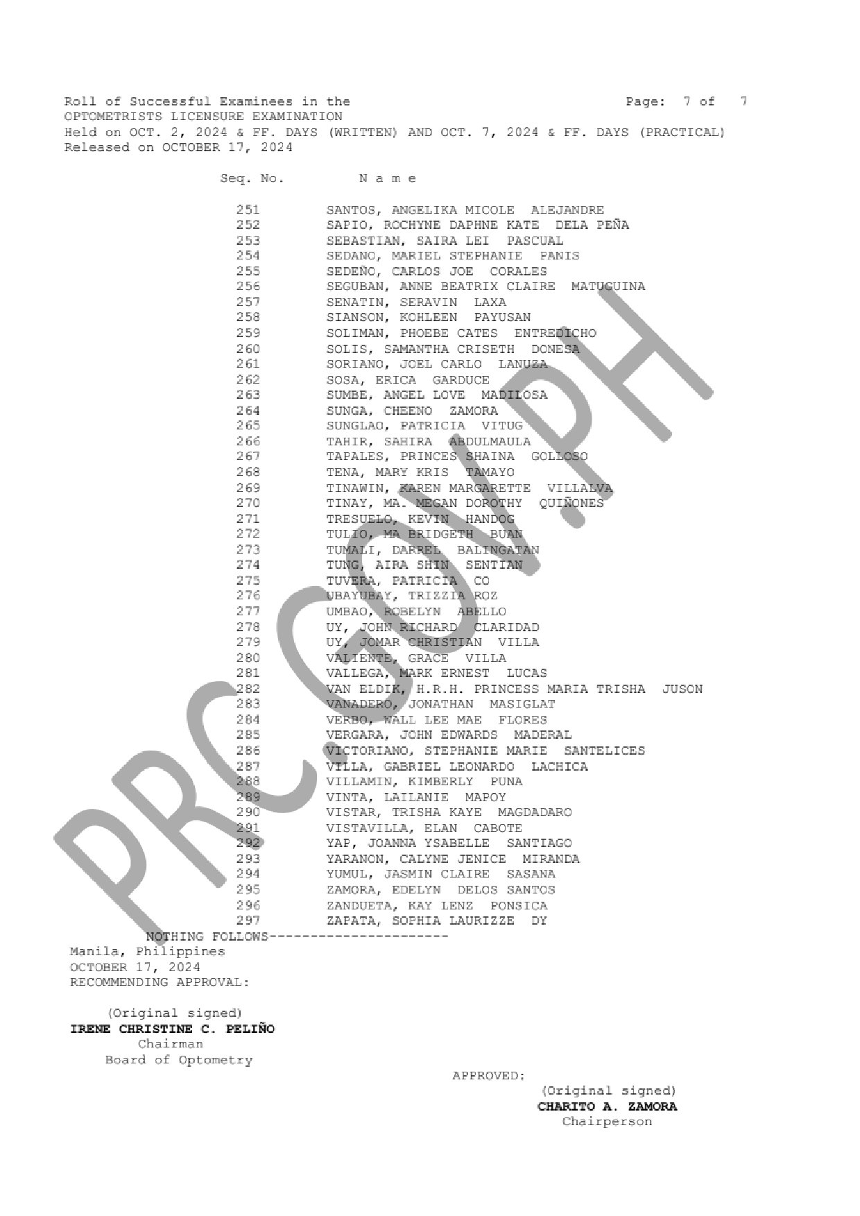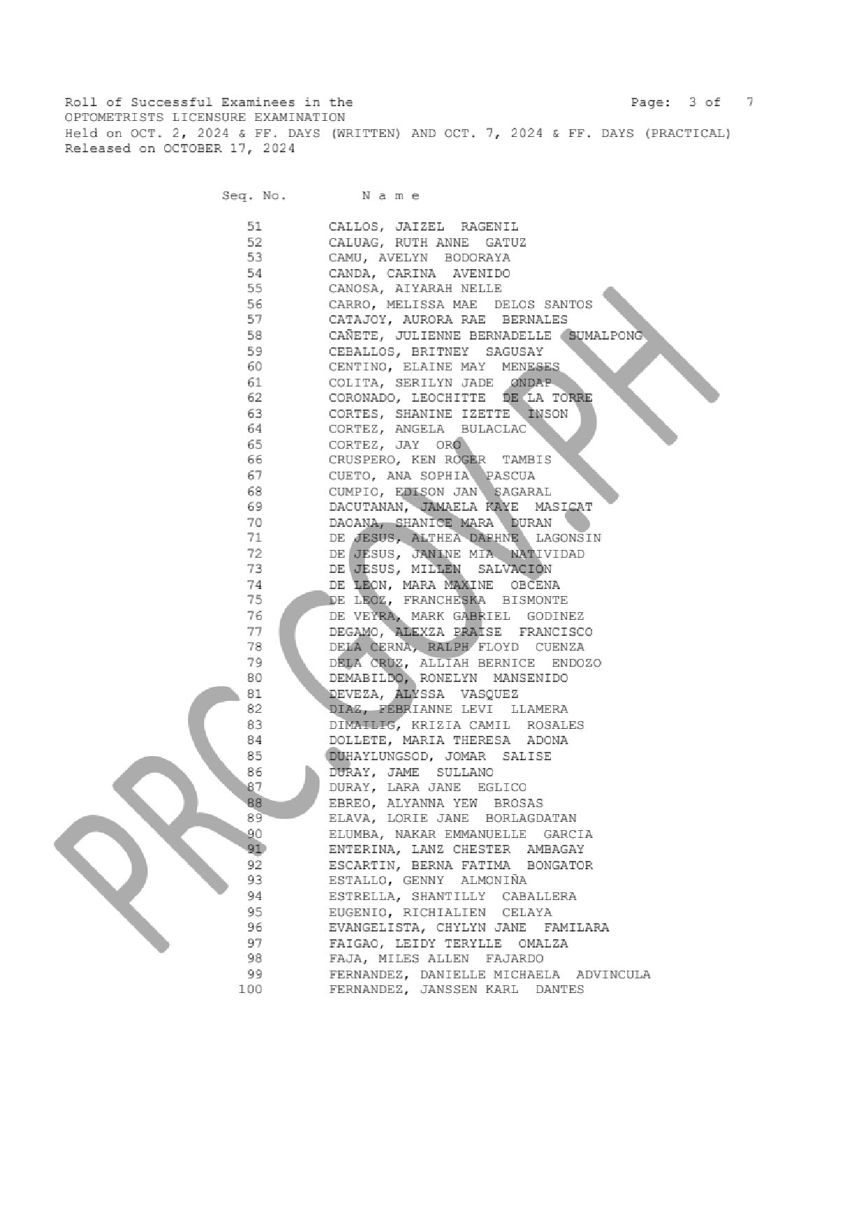 OLE LIST OF PASSERS: The Professional Regulation Commission (PRC) announces that 297 out of 327 passed the Optometrists Licensure Examination given by the Board of Optometry in N. C. R. this October 2024.