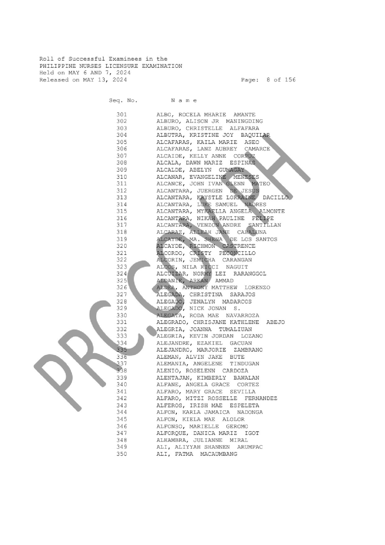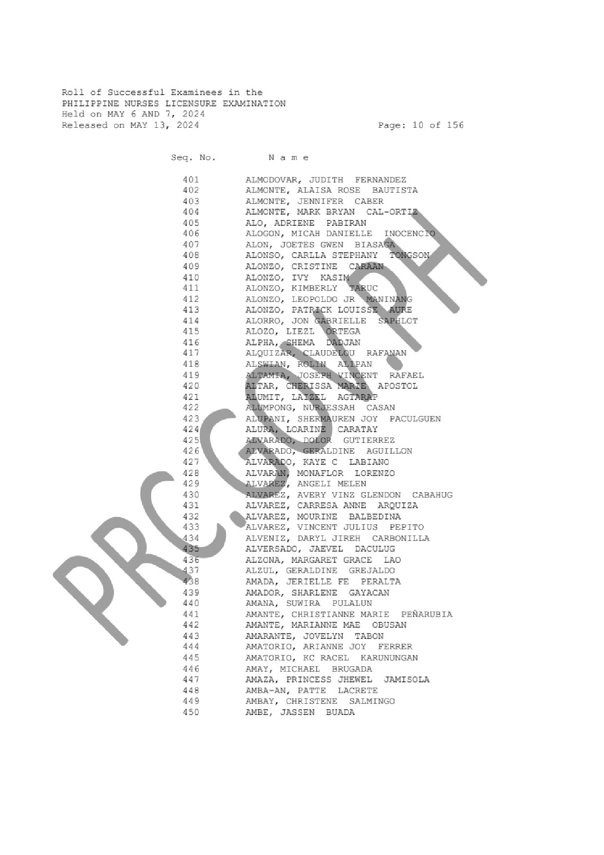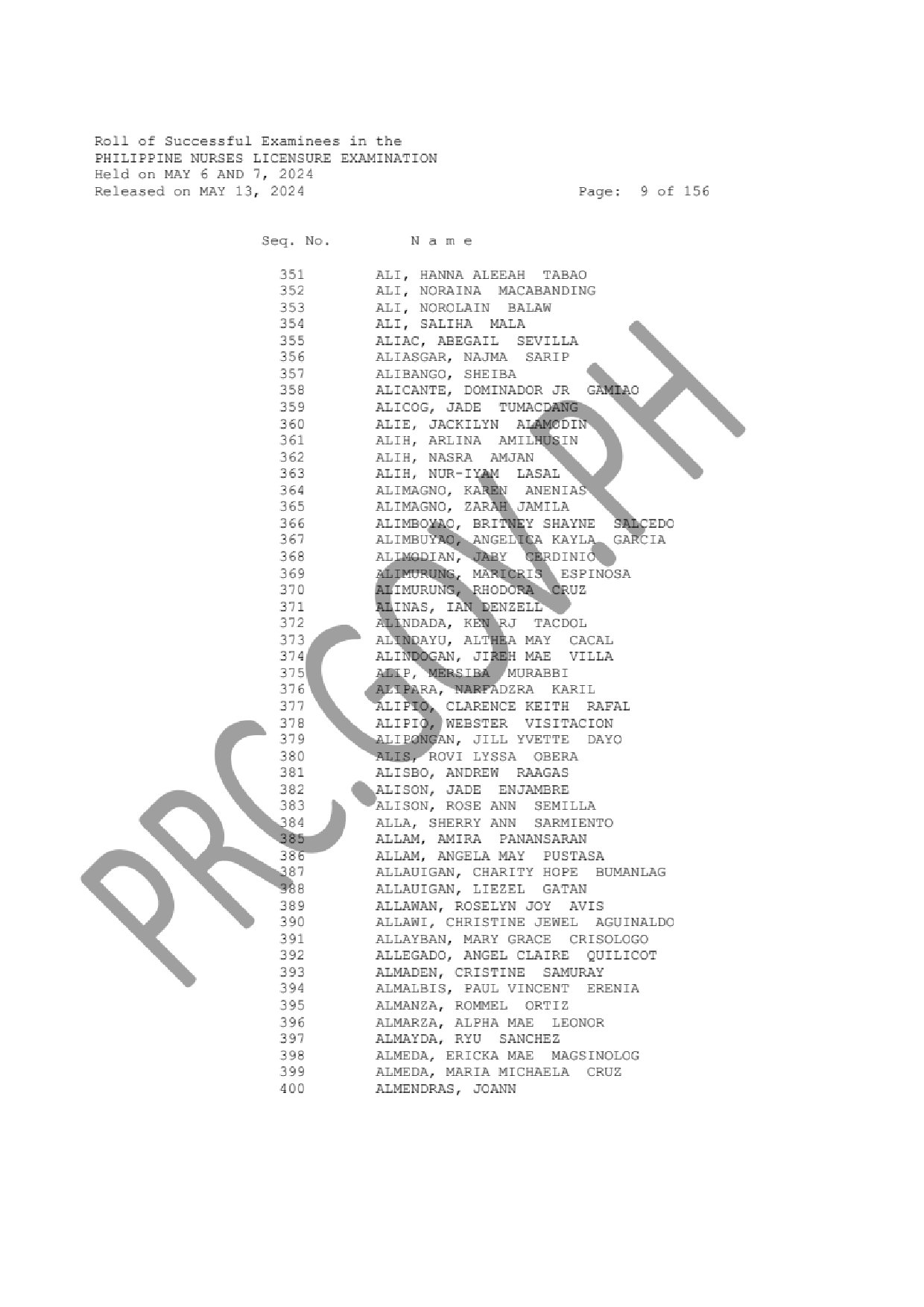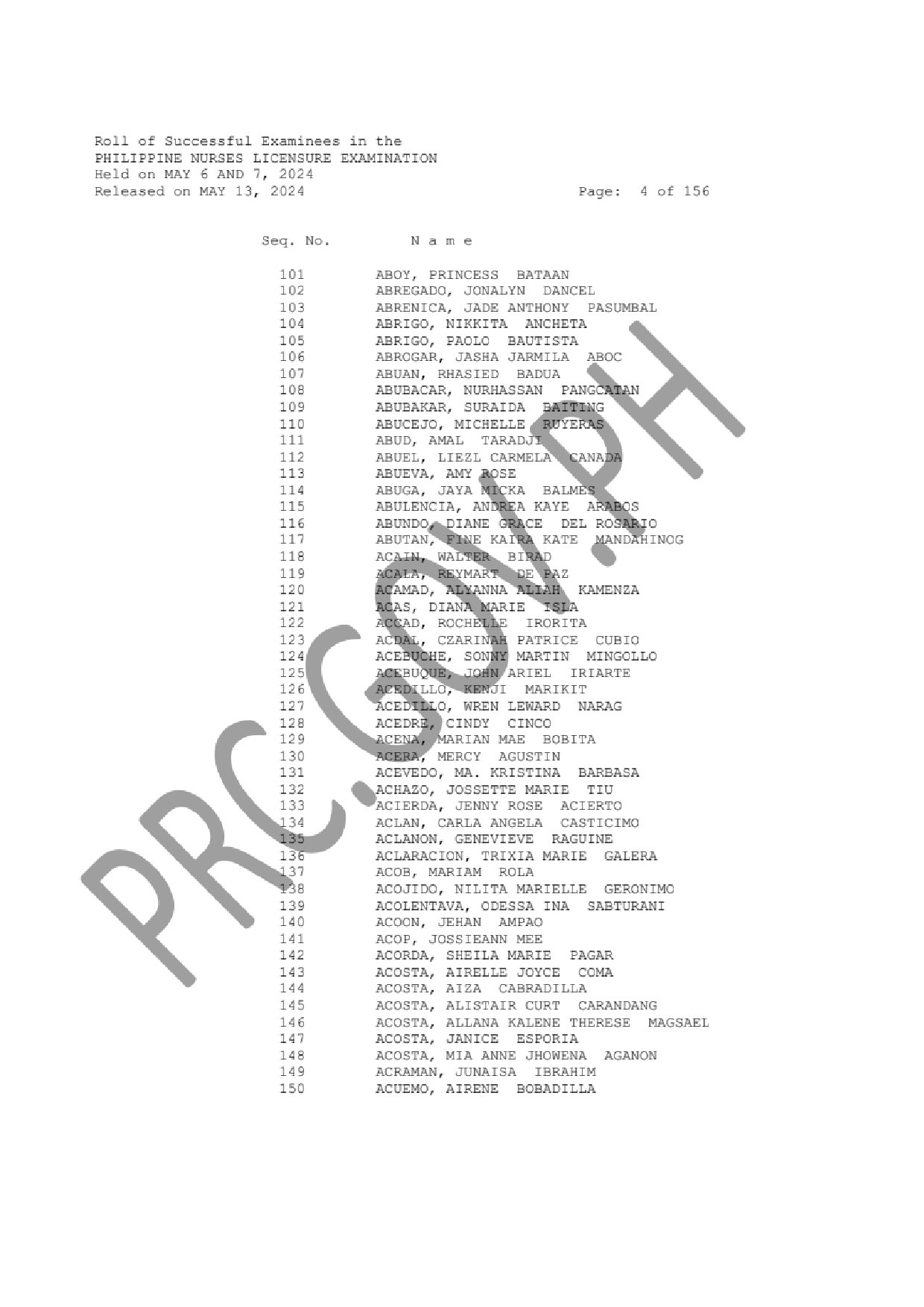 PNLE LIST OF PASSERS: The Professional Regulation Commission (PRC) announces that 7,749 out of 11,116 passed the Philippine Nurses Licensure Examination given by the Board of Nursing in N. C. R., Baguio, Butuan, Cagayan de Oro, Cebu, Davao, Iloilo, Koronadal, Legazpi, Lucena, Pagadian, Pampanga, Rosales, Tacloban, Tuguegarao, Zamboanga and Puerto Princesa, Palawan this May 2024. The results of examination with respect to two (2) examinees were withheld pending final determination of their liabilities under the rules and regulations governing licensure examinations.
