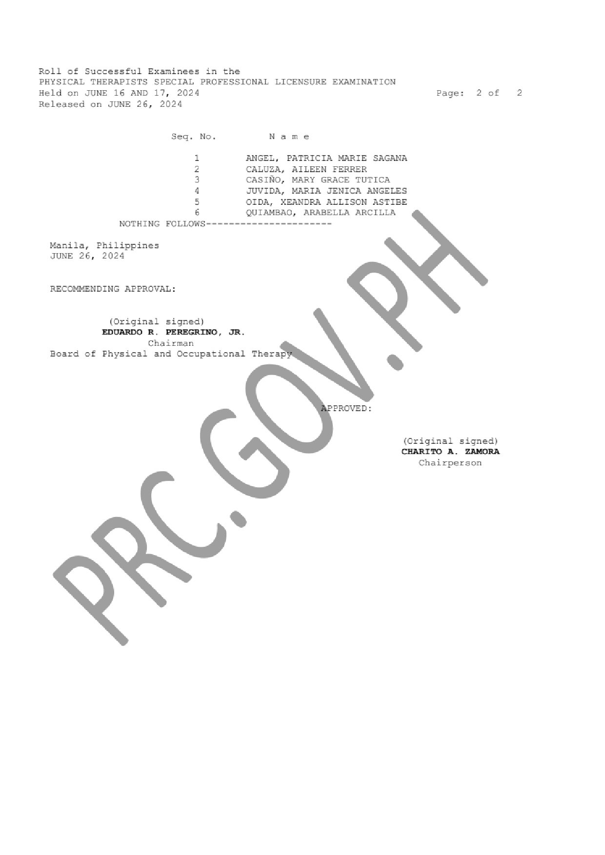 SPLE for PT LIST OF PASSERS: The Professional Regulation Commission (PRC) announces that 6 out of 15 passed the Physical Therapists Special Professional Licensure Examination given by the Board of Physical and Occupational Therapy in: Abu Dhabi and Dubai, United Arab Emirates; Al Ahmadi, Kuwait; Al-Khobar and Jeddah, Kingdom of Saudi Arabia; and Singapore this June 2024.