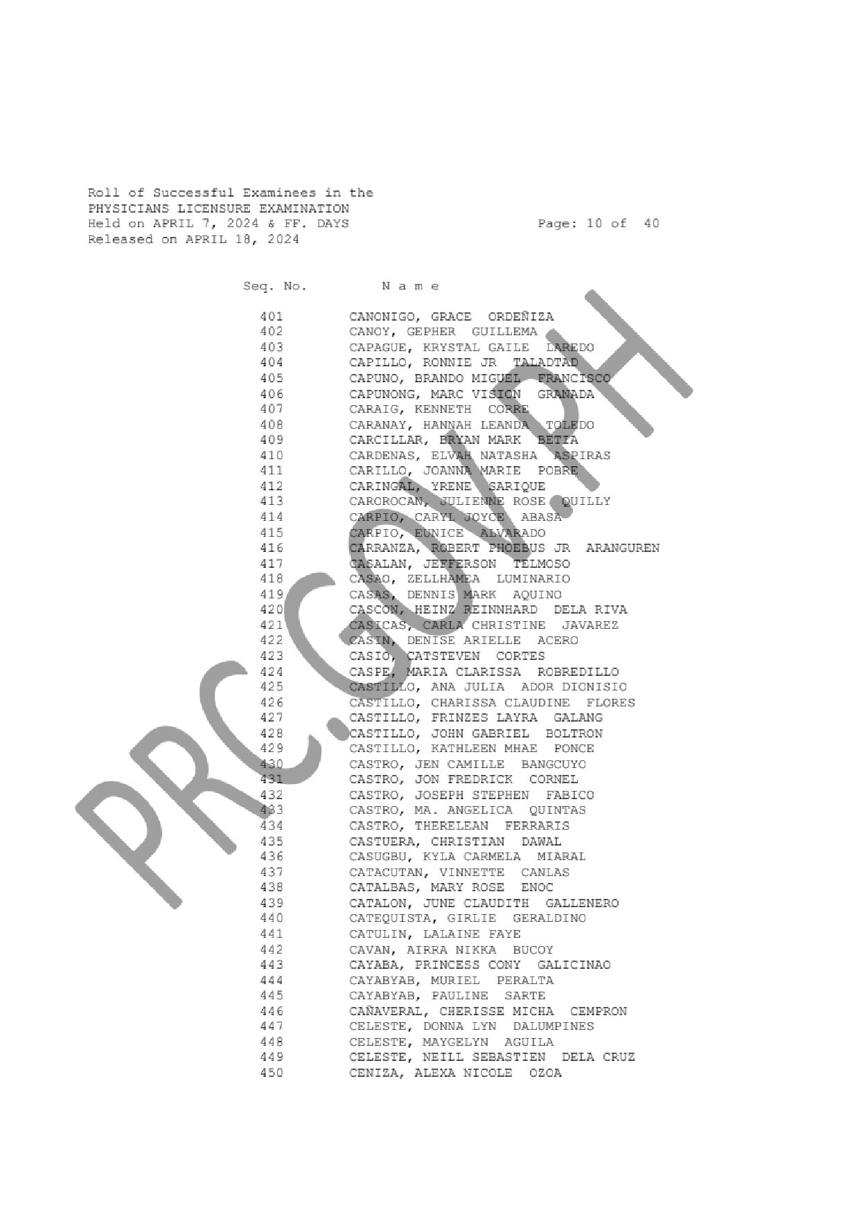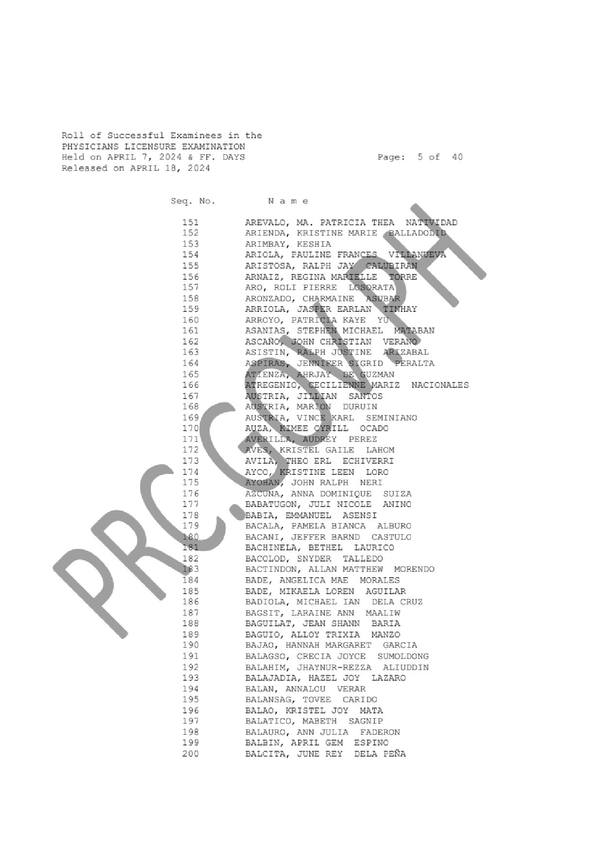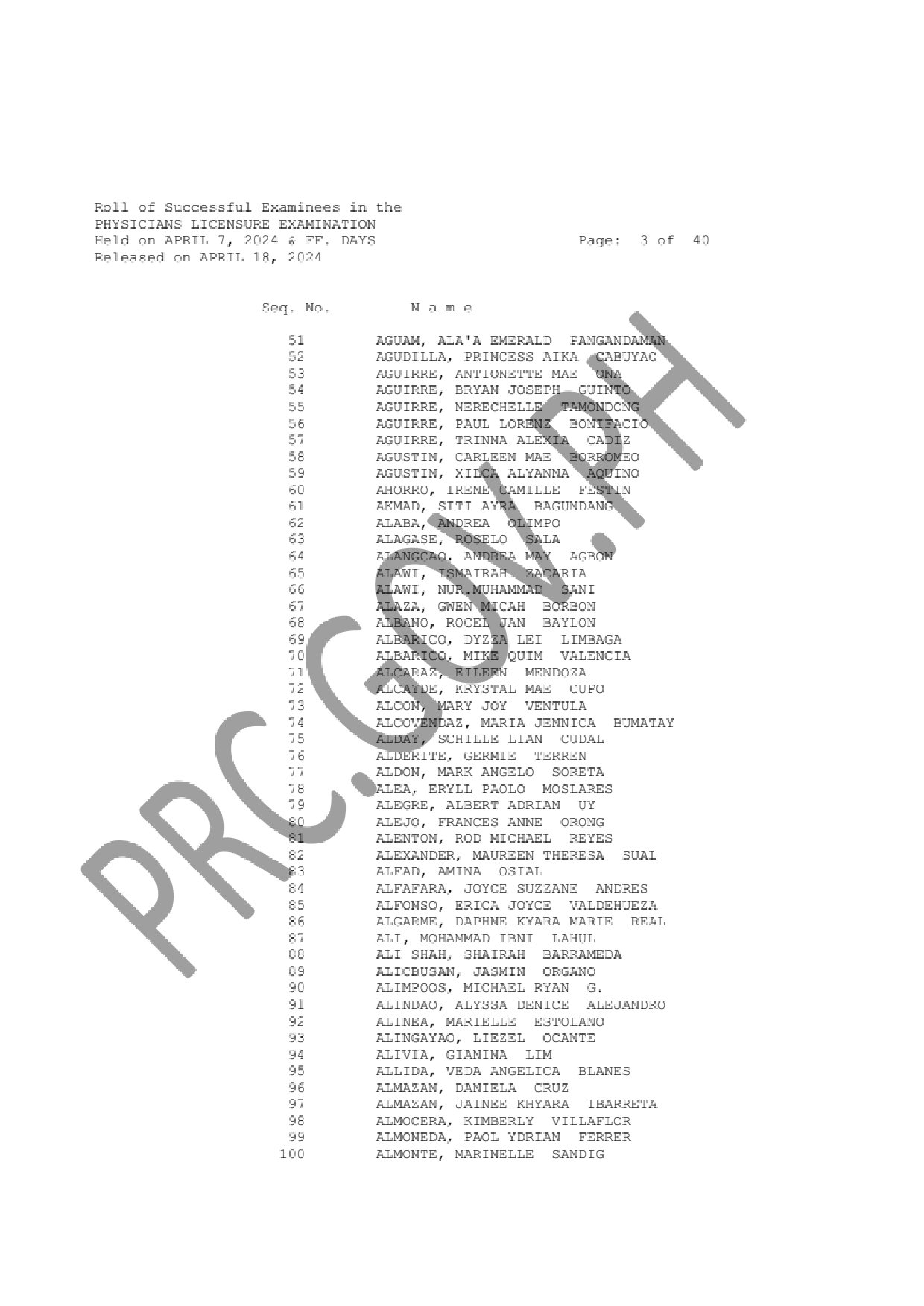 PLE LIST OF PASSERS: The Professional Regulation Commission (PRC) announces that 1,906 out of 3,434 passed the Physicians Licensure Examination given by the Board of Medicine in N. C. R., Baguio, Cagayan de Oro, Cebu, Davao, Iloilo, Legazpi, Lucena, Pampanga, Rosales, Tacloban, Tuguegarao and Zamboanga this April 2024. The results of examination with respect to three (3) examinees were withheld pending submission of the required documents.