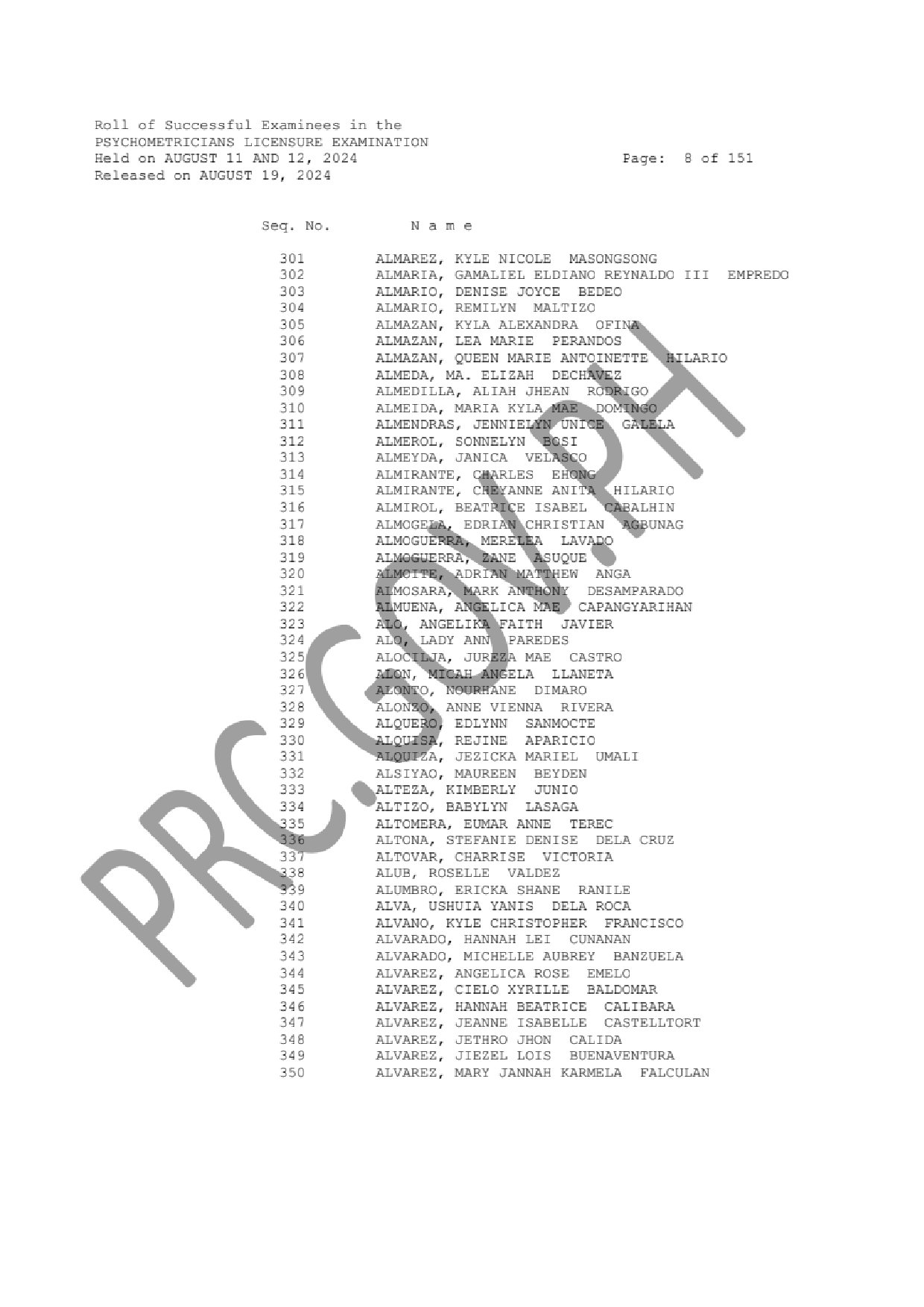 BLEPP LIST OF PASSERS: The Professional Regulation Commission (PRC) announces that 7,478 out of 10,717 passed the Psychometricians Licensure Examination given by the Board of Psychology in N. C. R., Baguio, Cebu and Davao this August 2024.