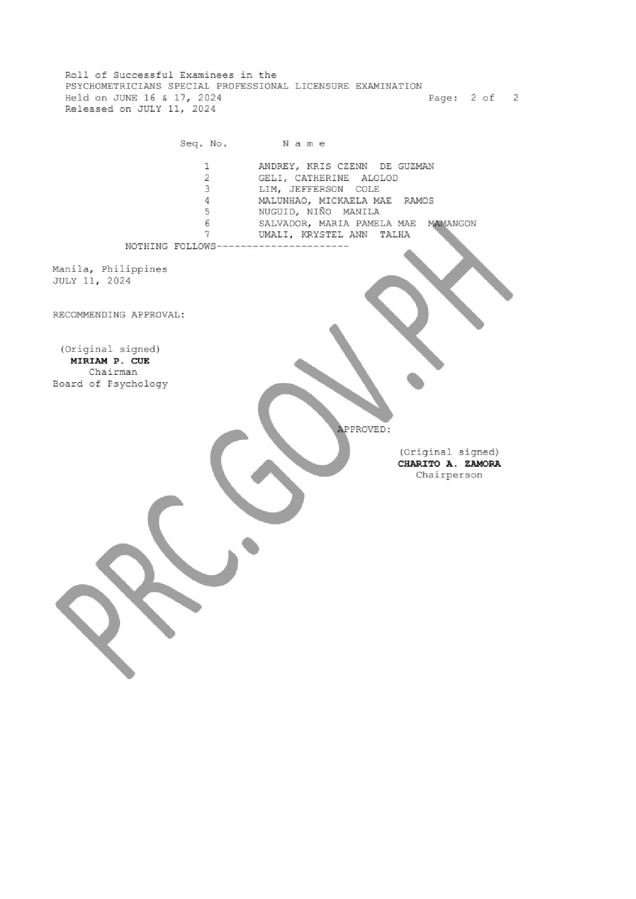 SPLE Psychometricians (BLEPP) LIST OF PASSERS: The Professional Regulation Commission (PRC) announces that 7 out of 16 passed the Psychometricians Special Professional Licensure Examination given by the Board of Psychology in: Abu Dhabi and Dubai, United Arab Emirates; Al Ahmadi, Kuwait; Al-Khobar and Riyadh, Kingdom of Saudi Arabia; Doha, Qatar; and Singapore last June 2024.