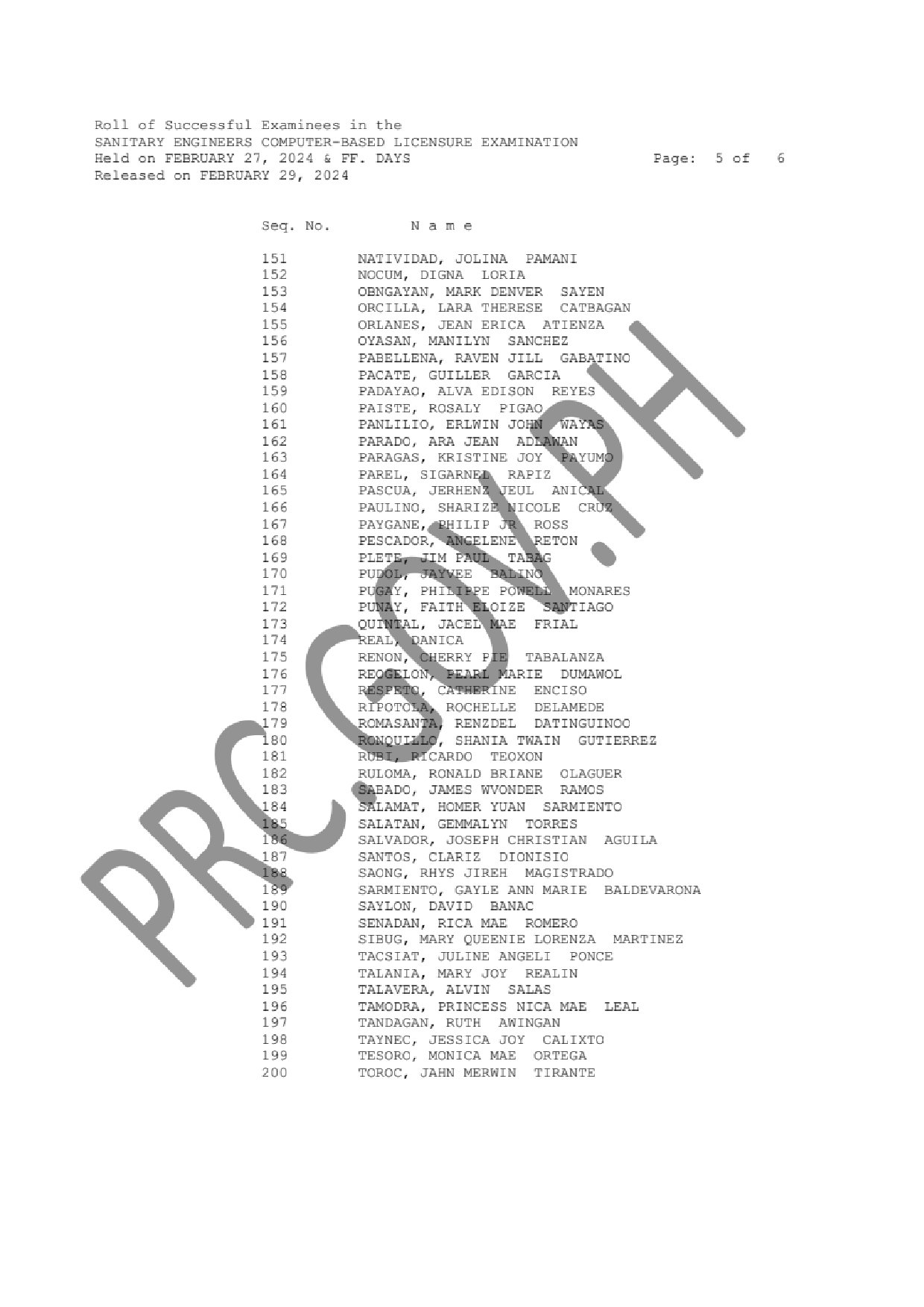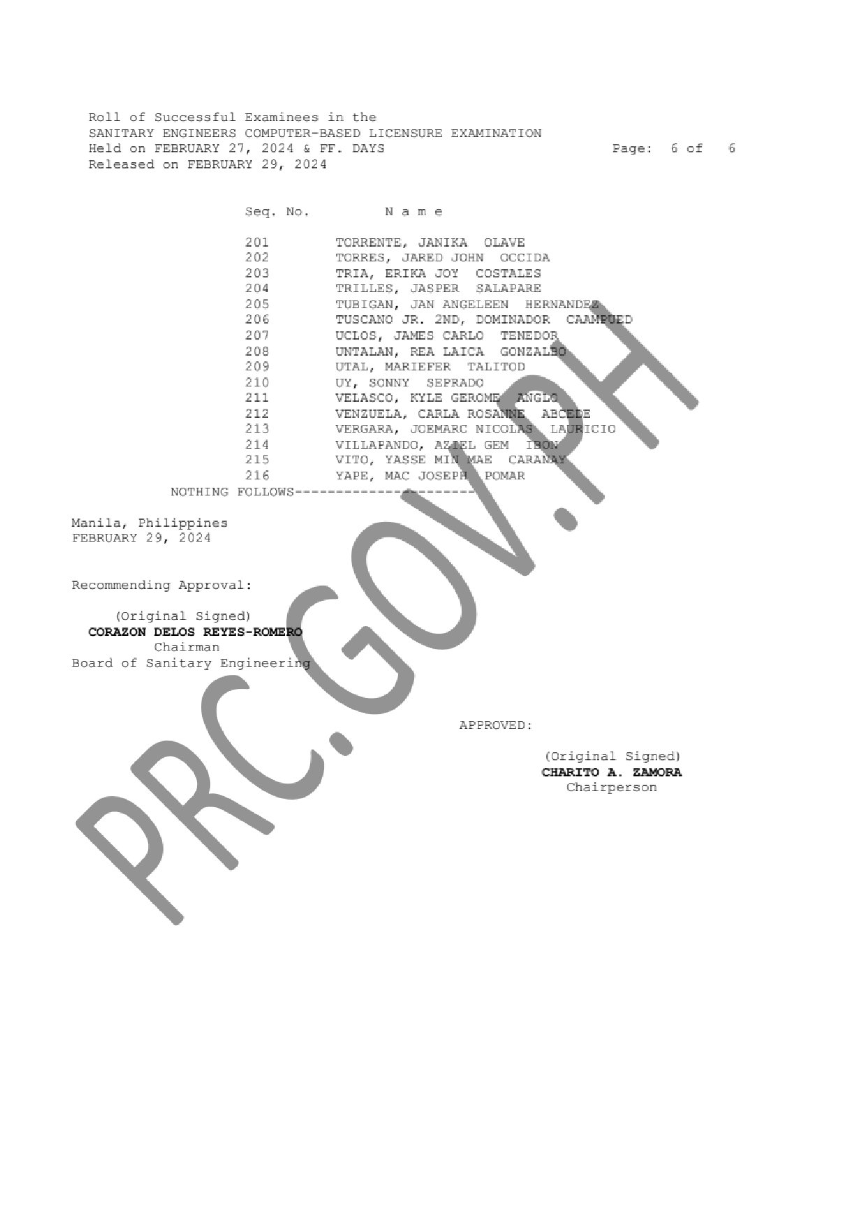 SELE LIST OF PASSERS: The Professional Regulation Commission (PRC) announces that 216 out of 300 passed the Sanitary Engineers Computer-Based Licensure Examination given by the Board of Sanitary Engineering in N. C. R and Rosales this February 2024.