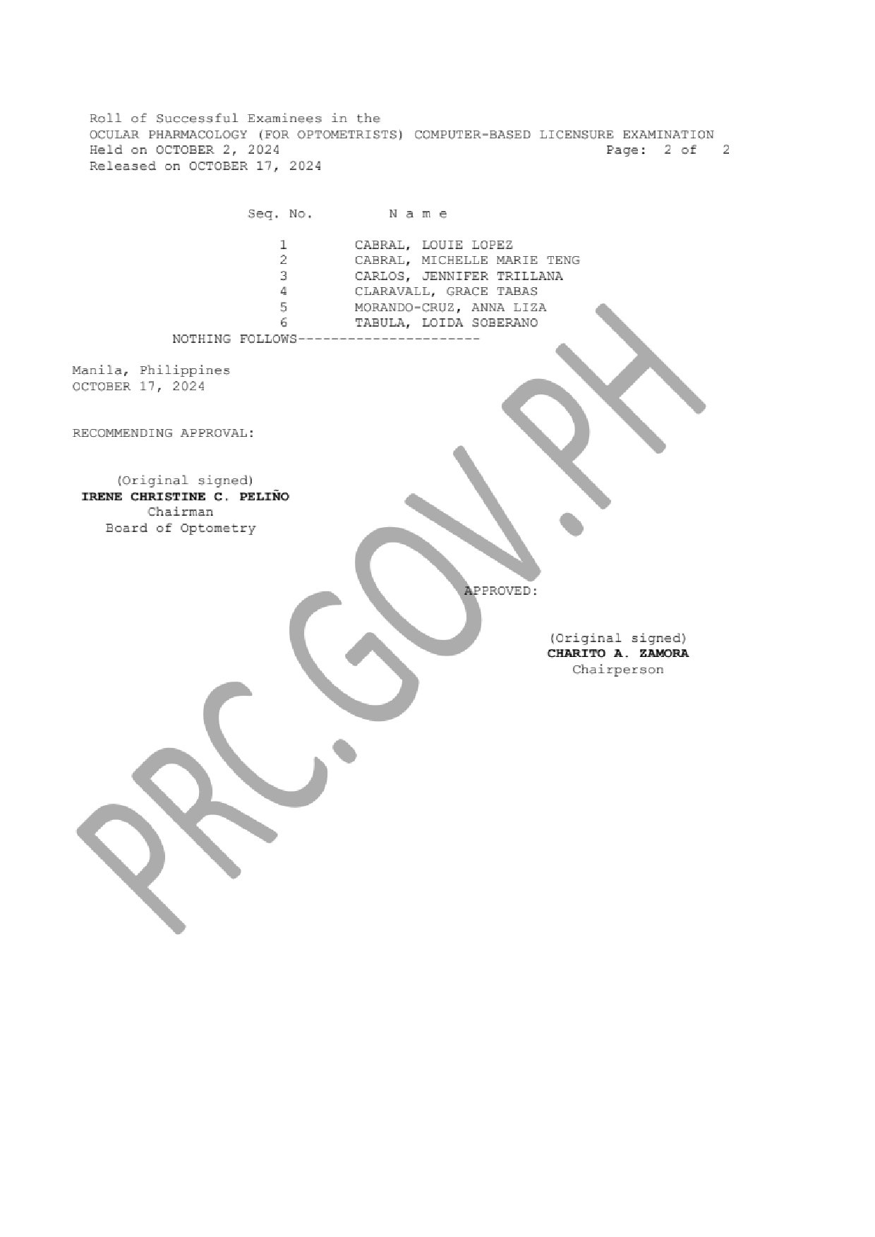 LIST OF PASSERS: The Professional Regulation Commission (PRC) announces that 6 out of 7 passed the Computer-Based Special Certification Examination in Ocular Pharmacology for Optometrists given by the Board of Optometry in N. C. R. this October 2024.