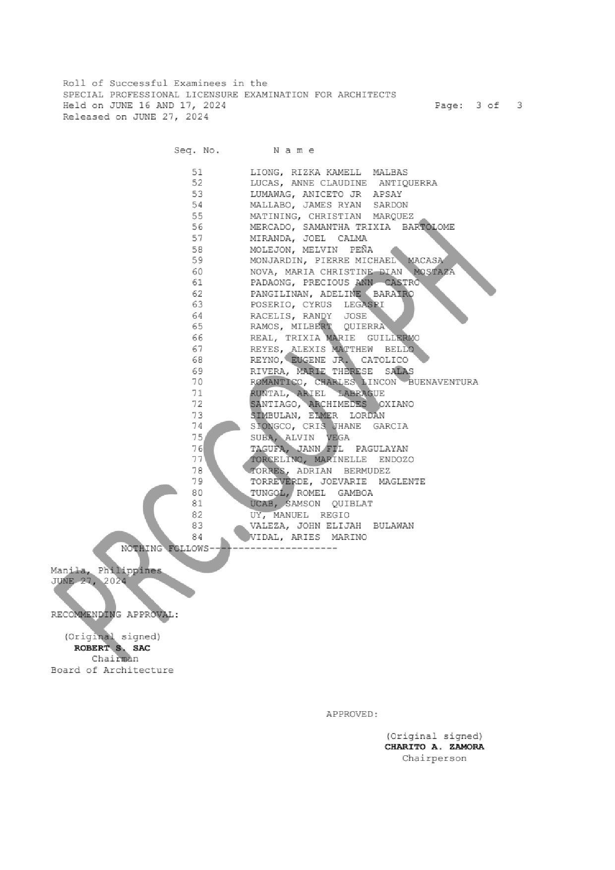 SPLE for Architects LIST OF PASSERS: The Professional Regulation Commission (PRC) announces that 84 out of 217 passed the Special Professional Licensure Examination for Architects given by the Board of Architecture headed by its Chairman, Arch. Robert S. Sac with two other members, Arch. Robert M. Mirafuente and Arch. Corazon V. Fabia-Tandoc. The examination was held in: Abu Dhabi and Dubai, United Arab Emirates; Al Ahmadi, Kuwait; Al-Khobar, Jeddah and Riyadh, Kingdom of Saudi Arabia; Doha, Qatar; Manama, Bahrain; and Singapore this June 2024.