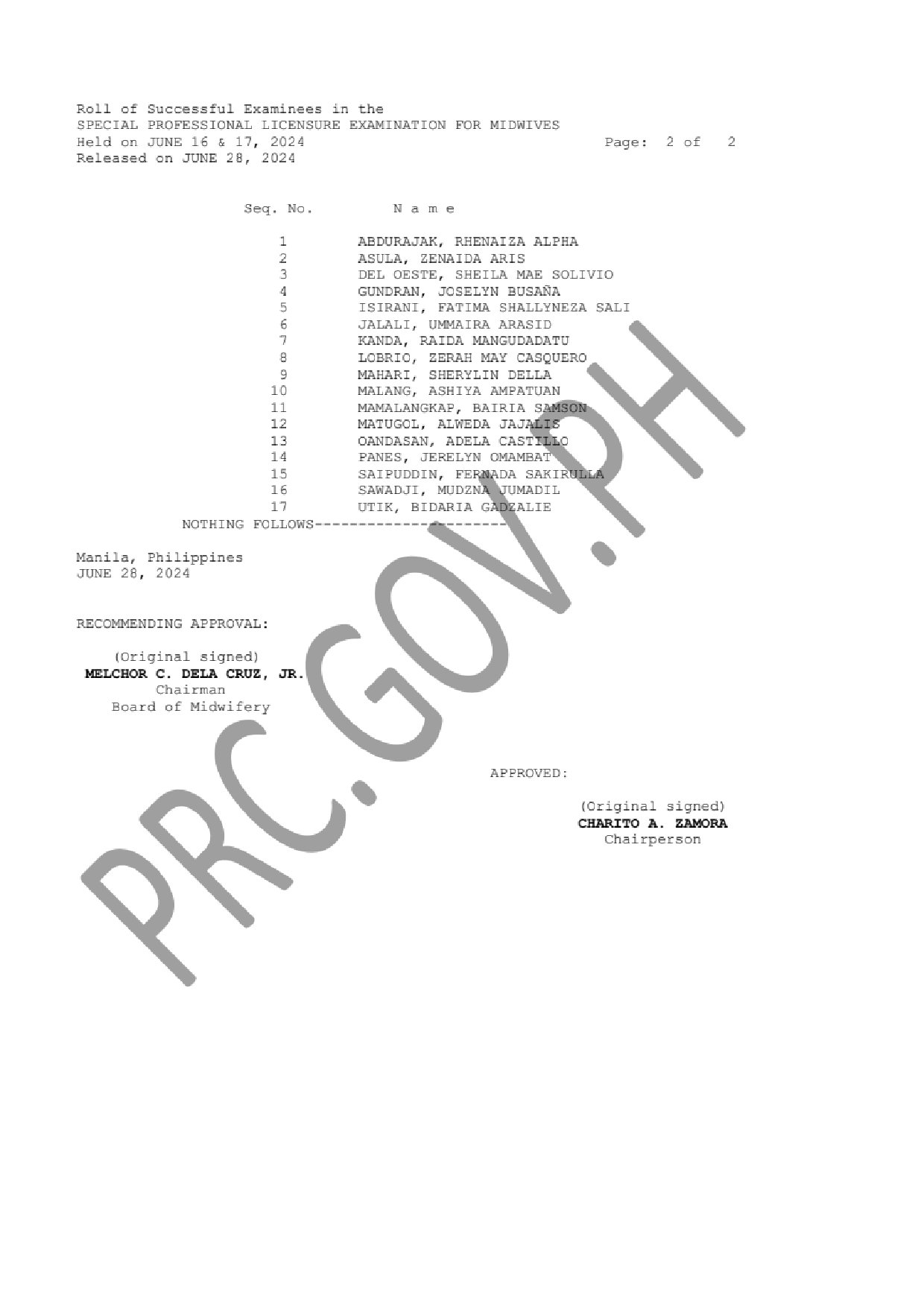 LIST OF PASSERS: The Professional Regulation Commission (PRC) announces that 17 out of 47 passed the Special Professional Licensure Examination for Midwives given by the Board of Midwifery in: Al Ahmadi, Kuwait; Al-Khobar, Jeddah and Riyadh, Kingdom of Saudi Arabia; Doha, Qatar; Manama, Bahrain and Singapore this June 2024.