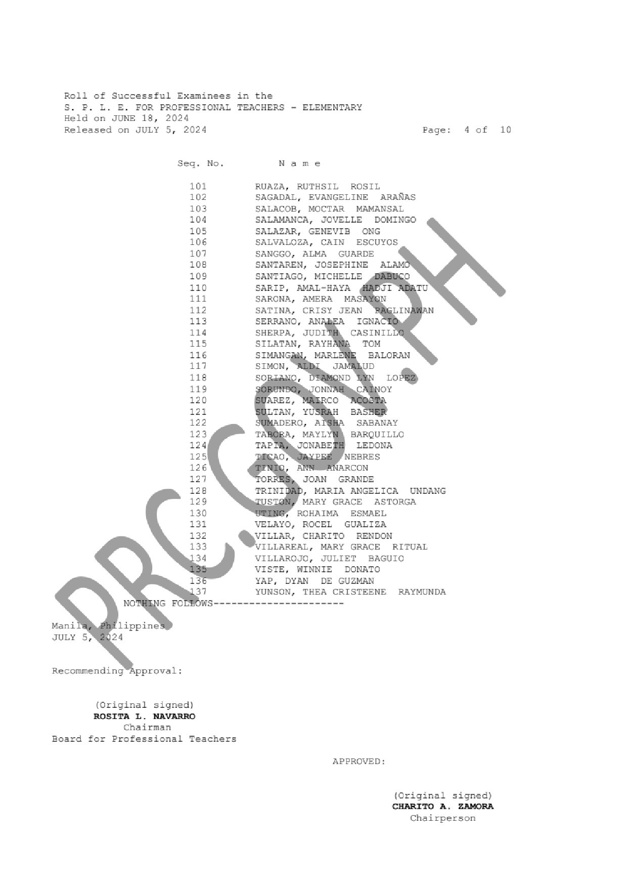 LIST OF PASSERS: Special Professional Licensure Examinations for Professional Teachers - Elementary Level Results Released June 2024 (JUNE 2024)