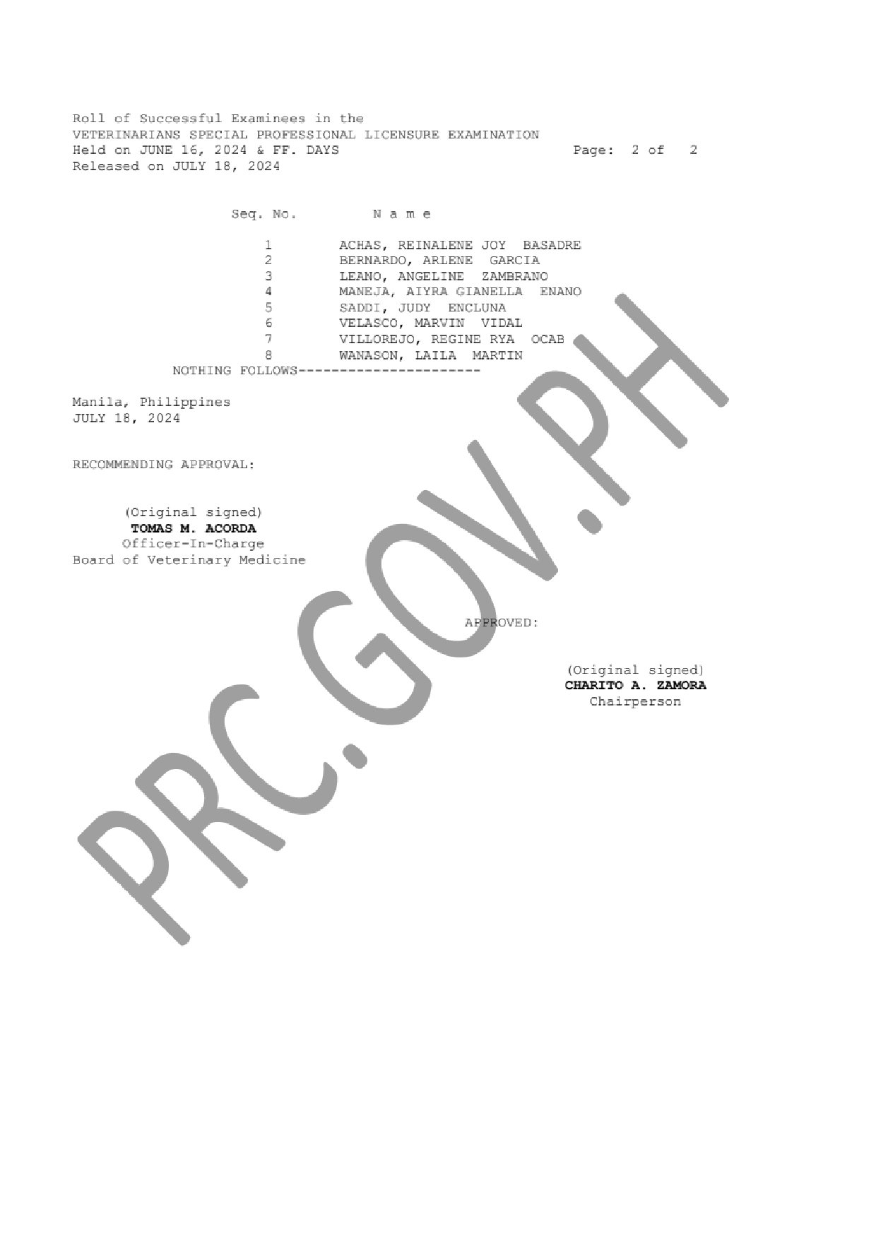 SPLE for Veterinarians LIST OF PASSERS: The Professional Regulation Commission (PRC) announces that 8 out of 26 passed the Veterinarians Special Professional Licensure Examination given by the Board of Veterinary Medicine in: Abu Dhabi and Dubai, United Arab Emirates; and Singapore last June 2024.