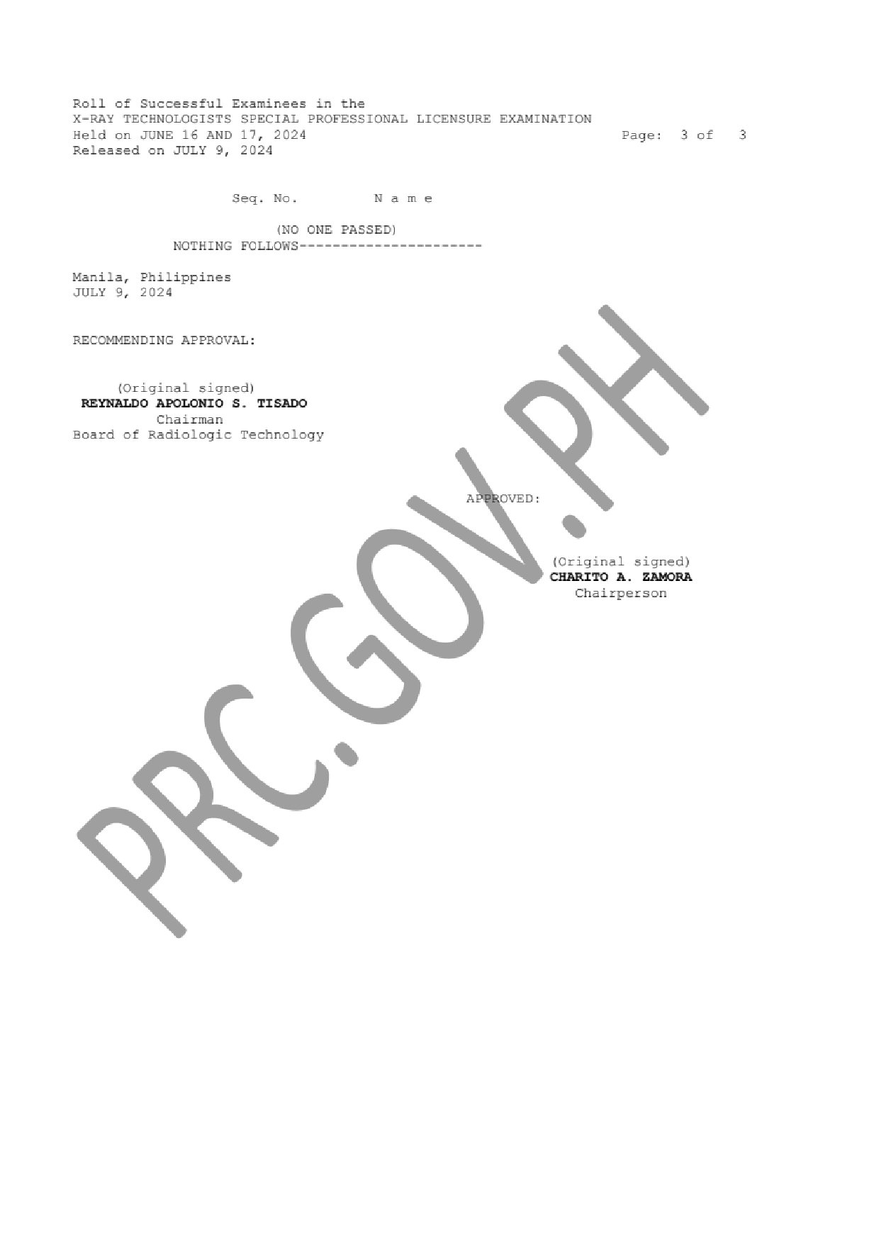 SPLE for X-RAY Techs LIST OF PASSERS: The Professional Regulation Commission (PRC) announces that 3 out of 41 passed the Radiologic Technologists Special Professional Licensure Examination and no one passed out of the 10 examinees in X-Ray Technologists Special Professional Licensure Examination given by the Board of Radiologic Technology in: Abu Dhabi and Dubai, United Arab Emirates; Al Ahmadi, Kuwait; Al-Khobar, Jeddah and Riyadh, Kingdom of Saudi Arabia; Doha, Qatar; and Manama, Bahrain last June 2024.