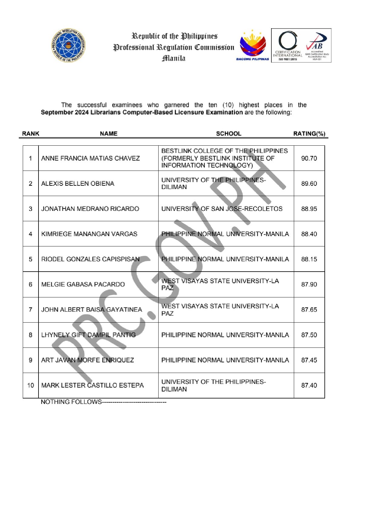 LLE TOPNOTCHERS: The Professional Regulation Commission (PRC / Commission) extends its warmest congratulations to the following TOPNOTCHERS in the recently concluded September 2024 Librarians Computer-Based Licensure Examination.