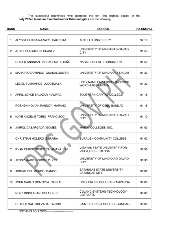 CLE TOPNOTCHERS: The list of topnotchers or the top 10 passers in the July-August 2024 Criminologist Board exams is available here as the Professional Regulation Commission (PRC) Board of Criminology releases the full results fourteen (14) working days after the exams.