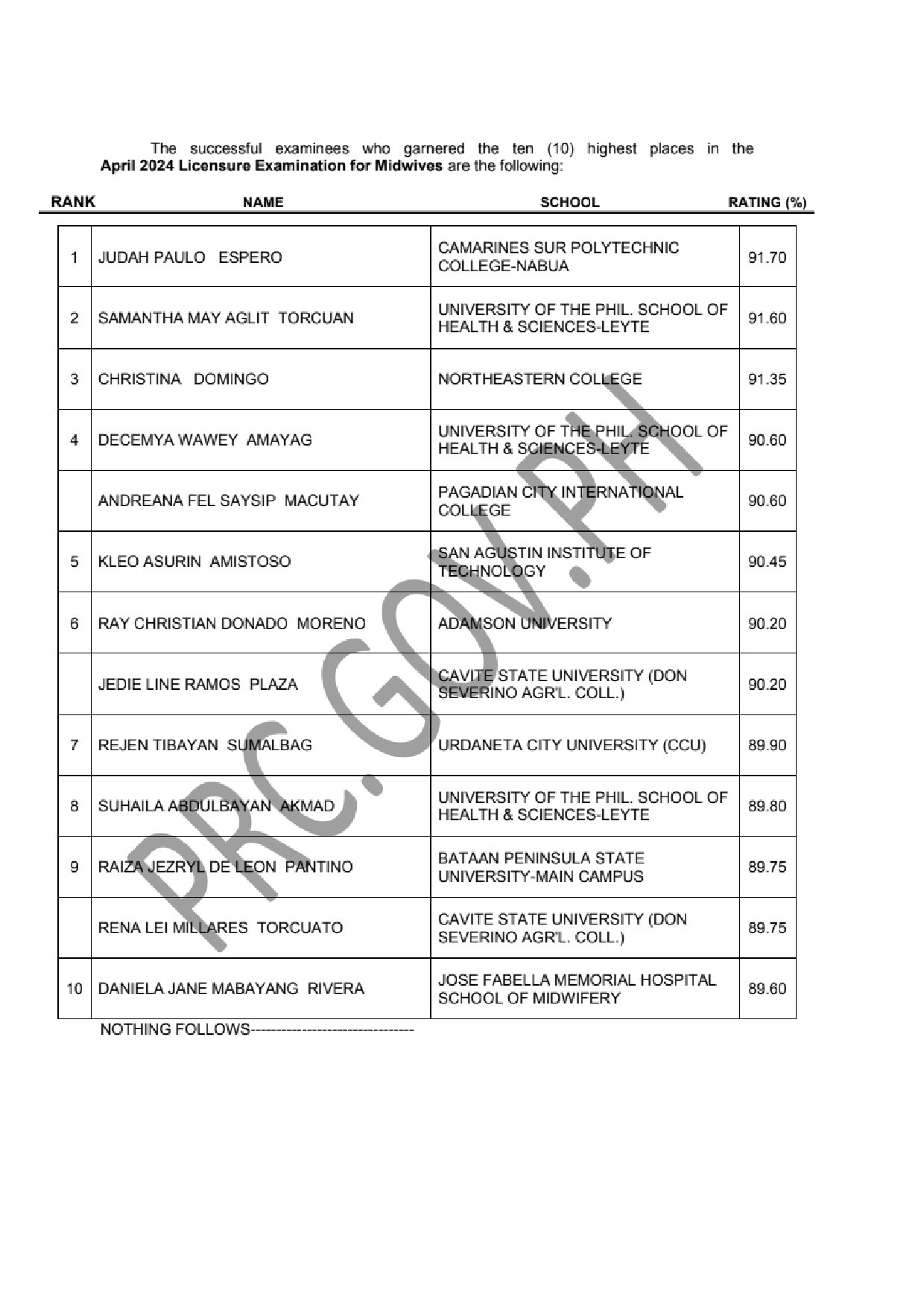 MLE TOPNOTCHERS: PRC recognizes the top 10 examinees who garnered the highest examination ratings in any of its administered licensure exams. Below is the complete list of the April 2024 Midwife board exam top 10 examinees, including their school and rating.