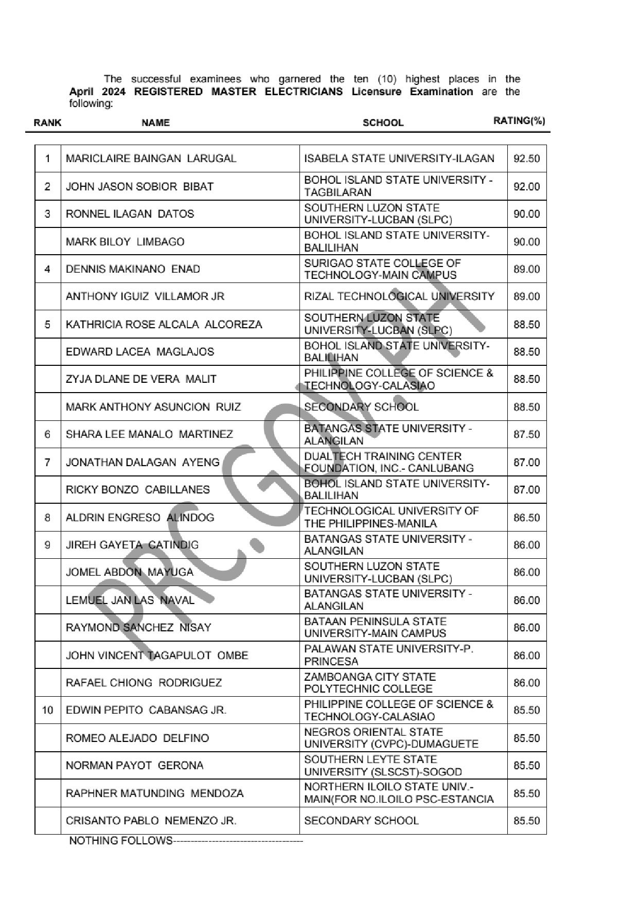 RMELE TOPNOTCHERS: The Professional Regulation Commission (PRC) announces that 4,436 out of 7,005 passed the Registered Electrical Engineers Licensure Examination and 629 out of 1,220 passed the Registered Master Electricians Licensure Examination given by the Board of Electrical Engineering in N. C. R., Baguio, Butuan, Cagayan de Oro, Cebu, Davao, Iloilo, Legazpi, Lucena, Pampanga, Rosales, Tacloban, Tuguegarao, Zamboanga and Puerto Princesa, Palawan last April 2024. The results of examination with respect to thirty-four (34) examinees were withheld pending final determination of their liabilities under the rules and regulations governing licensure examinations.