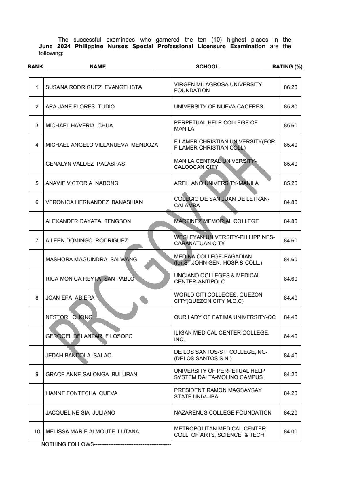 SPLE for NURSES TOPNOTCHERS: PRC recognizes the top 10 examinees who garnered the highest examination ratings in its administered licensure exams. Below is the list of the top 10 examinees in the June 2024 SPLE for Nurses, including their school and rating.