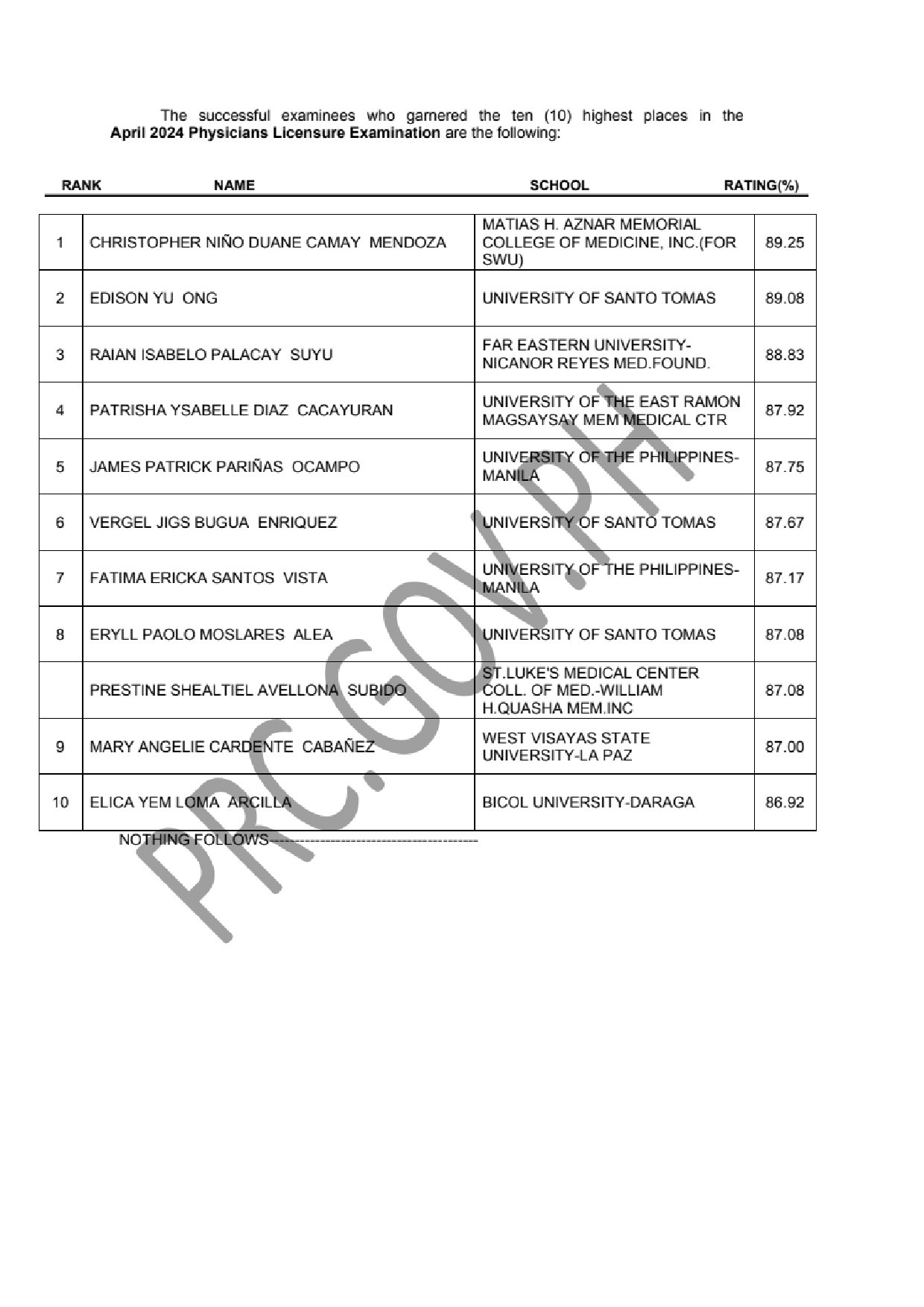 TOPNOTCHERS: Physicians Licensure Examination Results April 2024 (APRIL 2024)