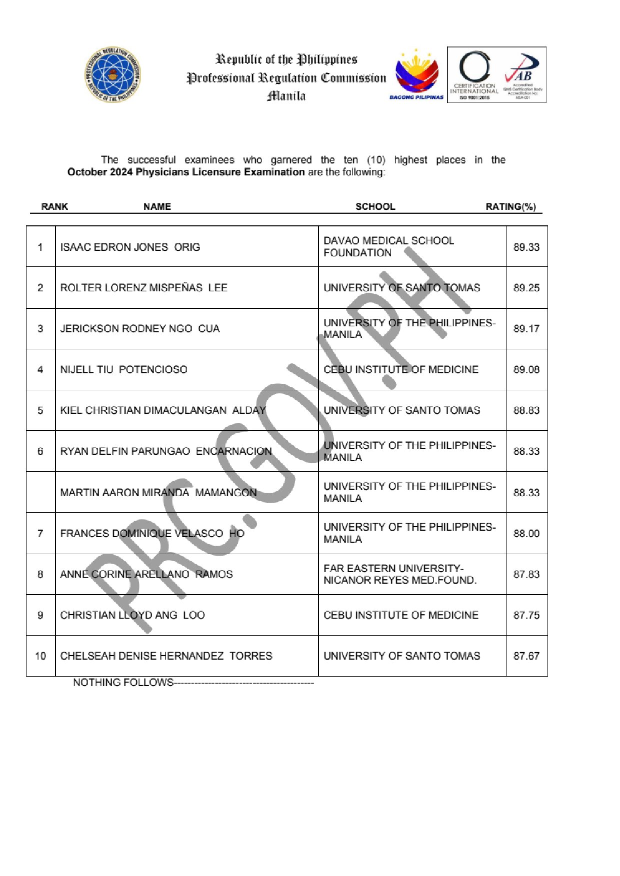 TOPNOTCHERS: Physicians Licensure Examination Results October 2024 (OCTOBER 2024)
