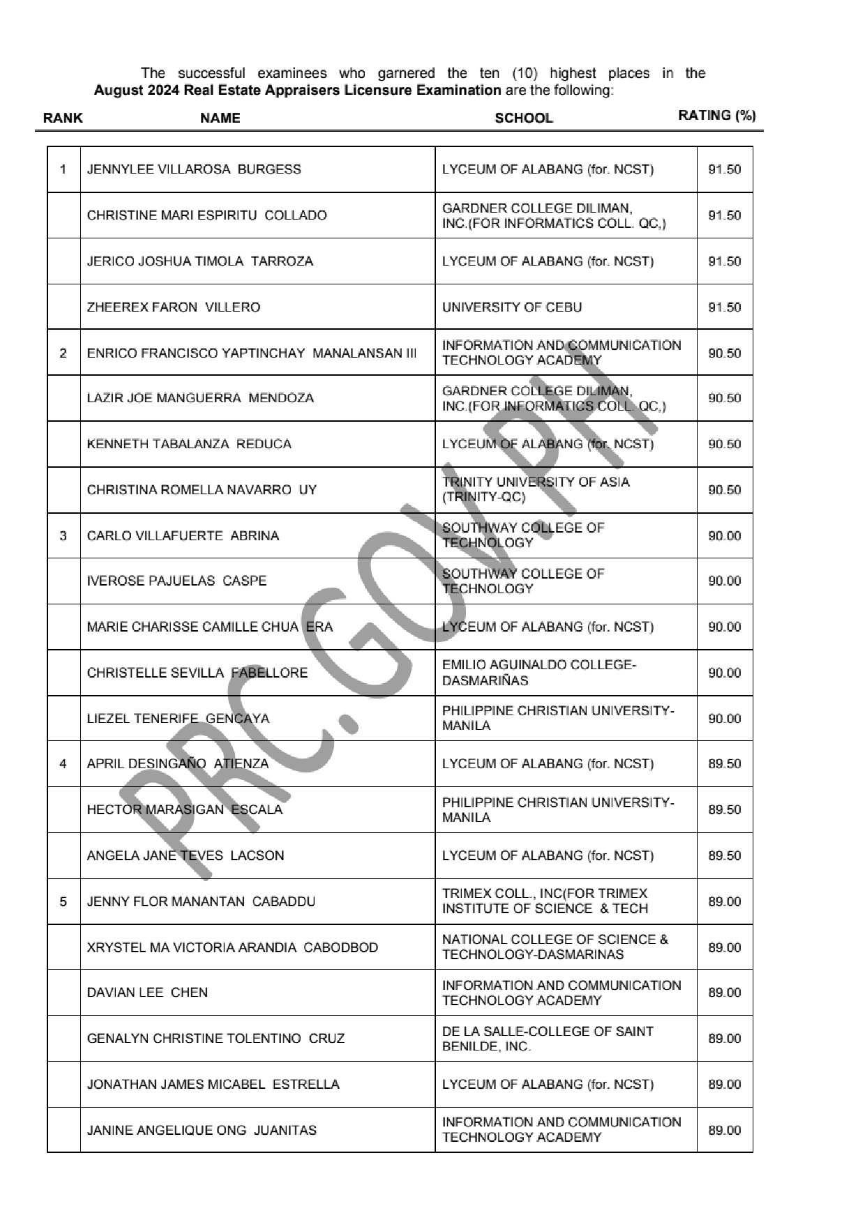 TOPNOTCHERS: The list of topnotchers or the top 10 passers in the August 2024 Real Estate Appraiser Board exams is available here as the Professional Regulation Commission (PRC) Board of Medical Technology releases the full results two (2) working days after the exams.