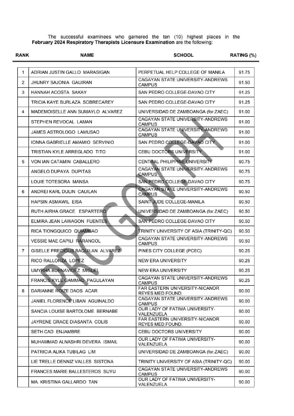 Respiratory Therapists LE TOPNOTCHERS: PRC recognizes the top 10 examinees with the highest examination ratings in all licensure exams. Check out the February 2024 Respiratory Therapist Board exam’s top-notchers, along with their schools and ratings. Below is the list, courtesy of the PRC.