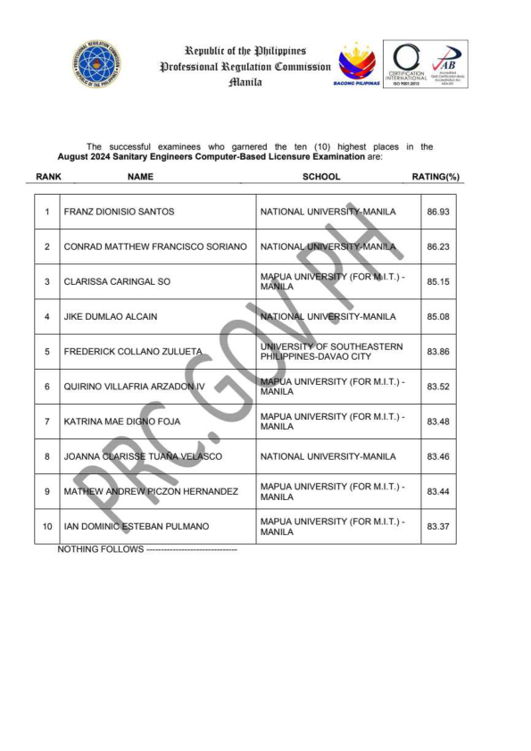 SELE TOPNOTCHERS - The Professional Regulation Commission (PRC / Commission) extends its warmest congratulations to the following TOPNOTCHERS in the recently concluded August 2024 Sanitary Engineers Computer-Based Licensure Examination. The Professional Regulation Commission (PRC) announces that 105 out of 156 passed the Sanitary Engineers Computer-Based Licensure Examination given by the Board of Sanitary Engineering in N. C. R. this August 2024.