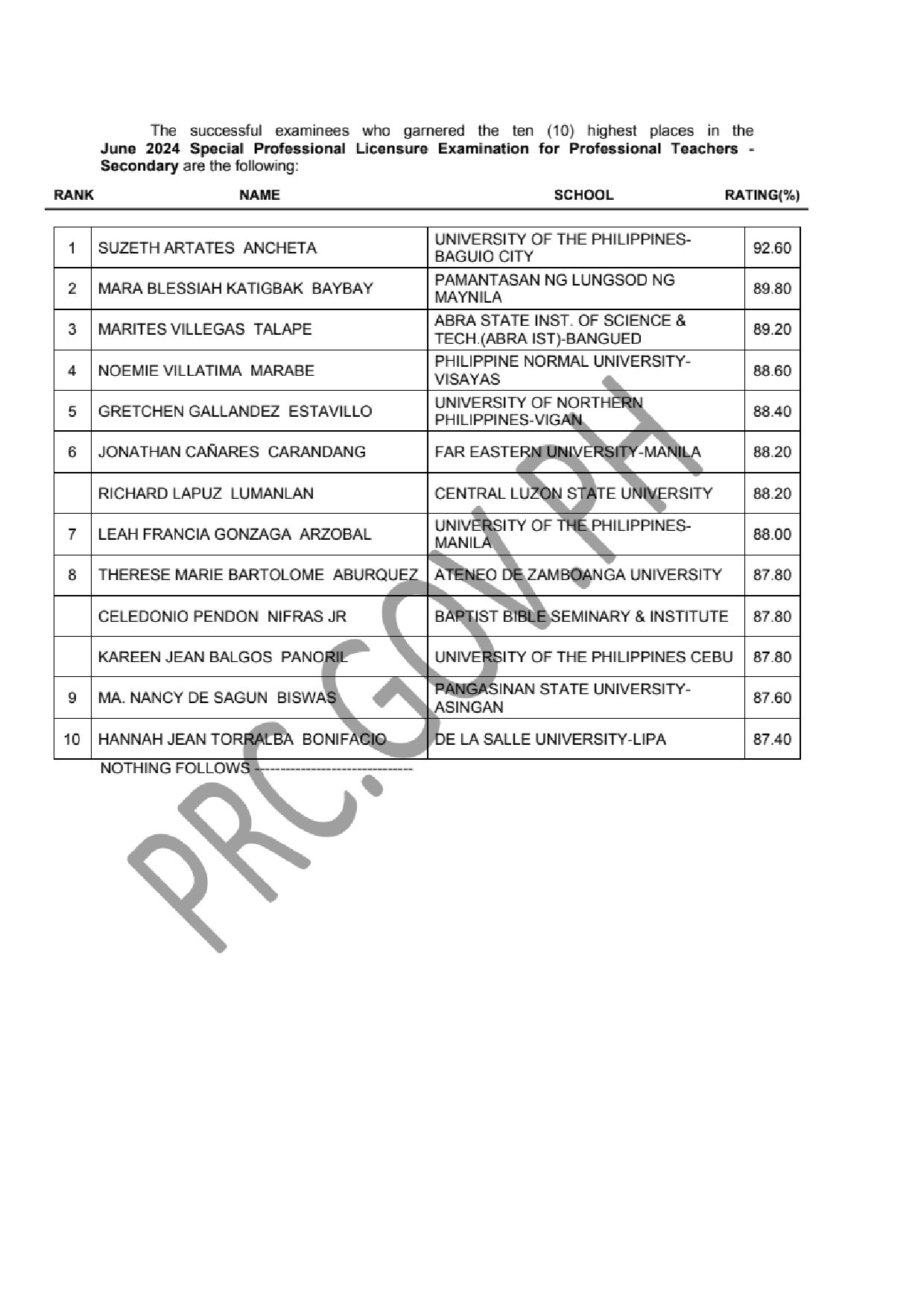SPLE for Professional Teachers - Secondary Level TOPNOTCHERS: PRC recognizes the top 10 examinees who garnered the highest examination ratings in its administered licensure exams. Below is the list of the top 10 examinees in the June 2024 SPLE for Professional Teachers – Secondary Level, including their school and rating.