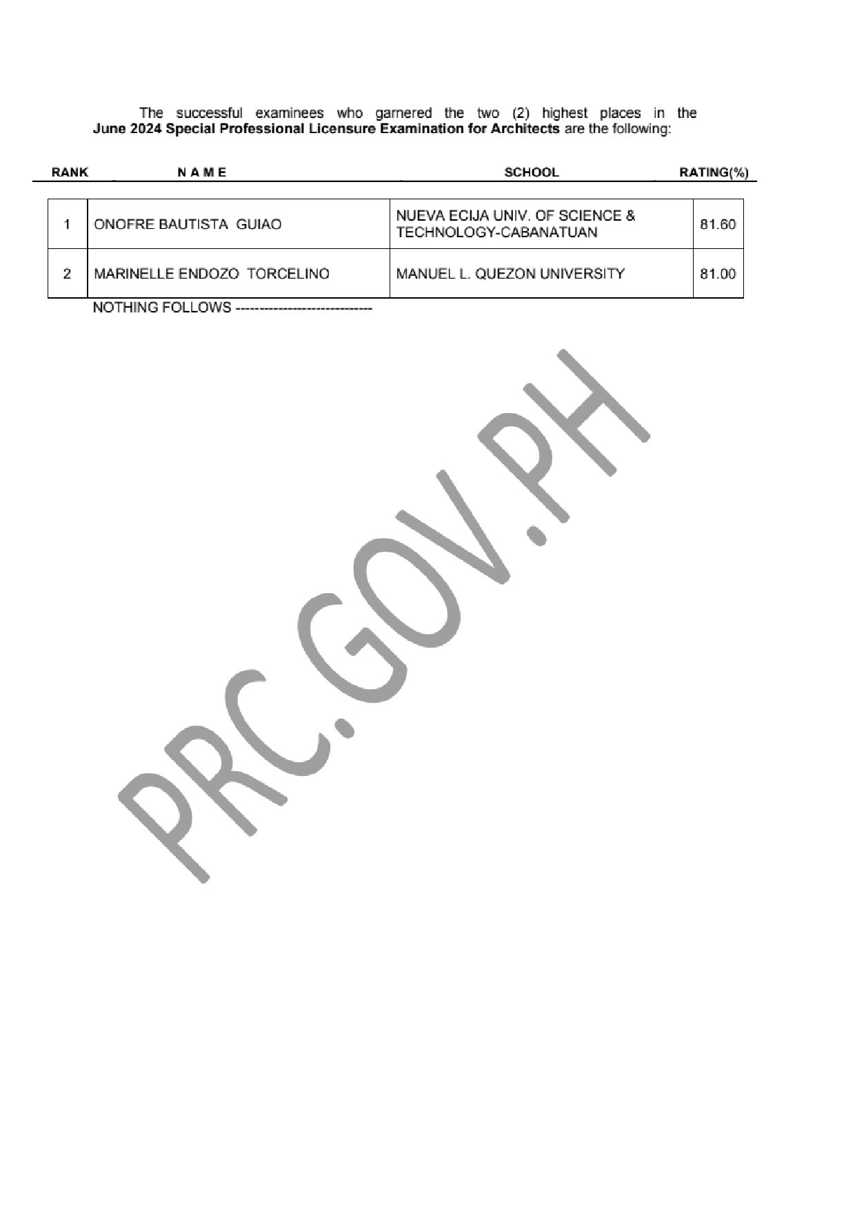 SPLE for Architects LIST OF PASSERS: PRC recognizes the top 2 examinees who garnered the highest examination ratings in its administered licensure exams. Below is the list of the June 2024 SPLE for Architecture top 2 examinees, including their school and rating.