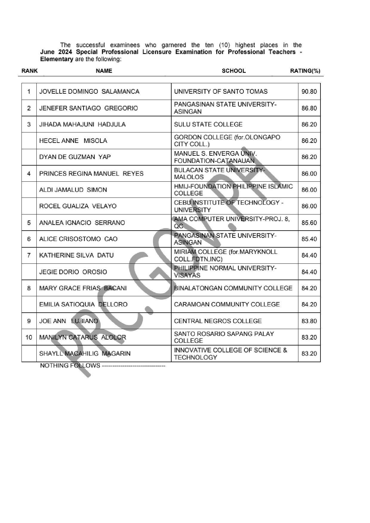 SPLE for Professional Teachers - Elementary Level TOPNOTCHERS: PRC recognizes the top 10 examinees who garnered the highest examination ratings in its administered licensure exams. Below is the list of the top 10 examinees in the June 2024 SPLE for Professional Teachers – Elementary Level, including their school and rating.